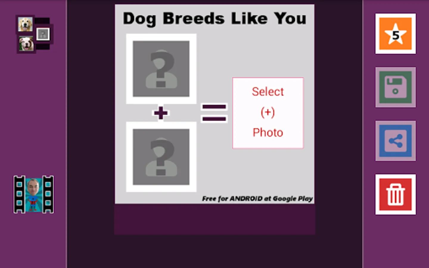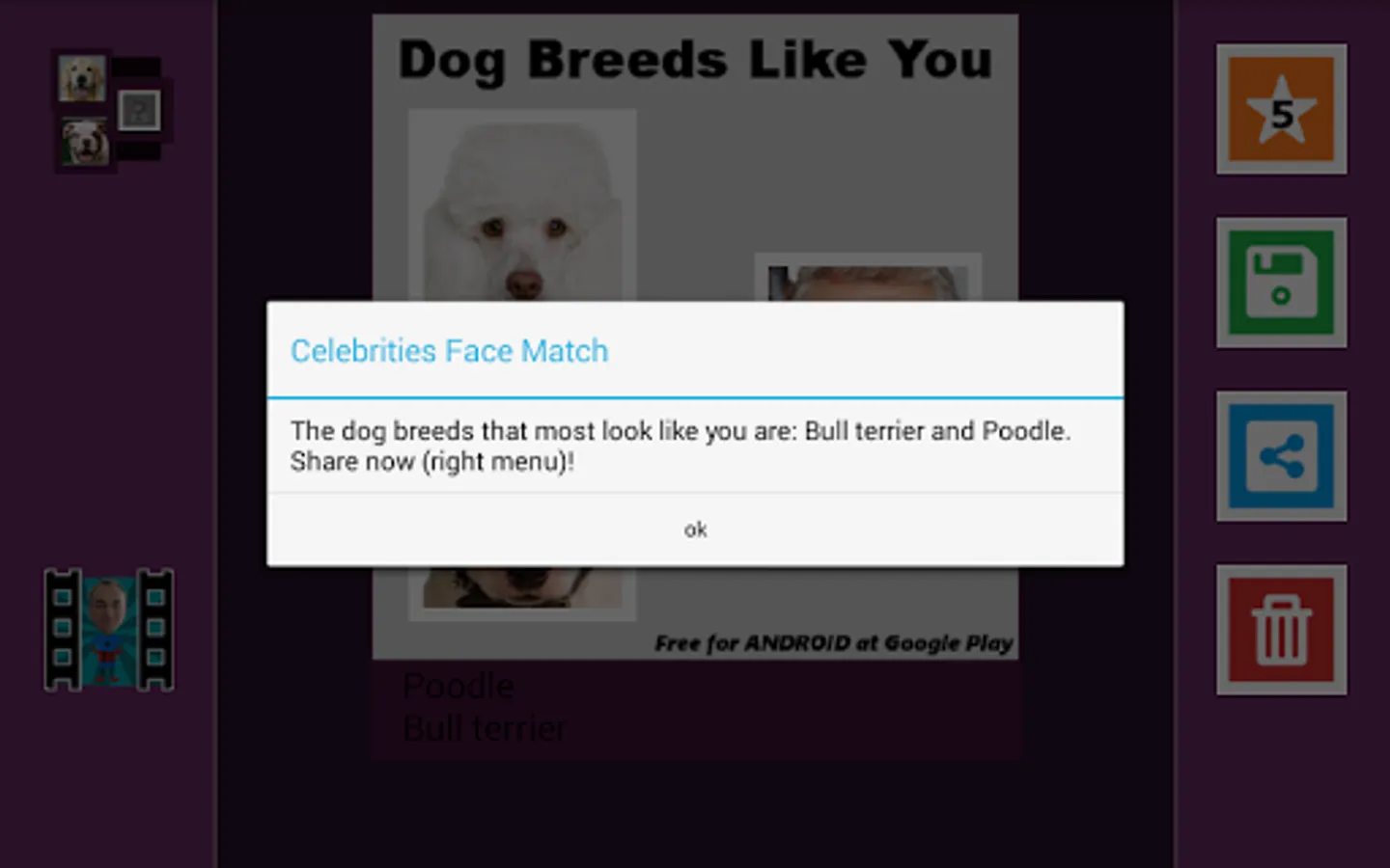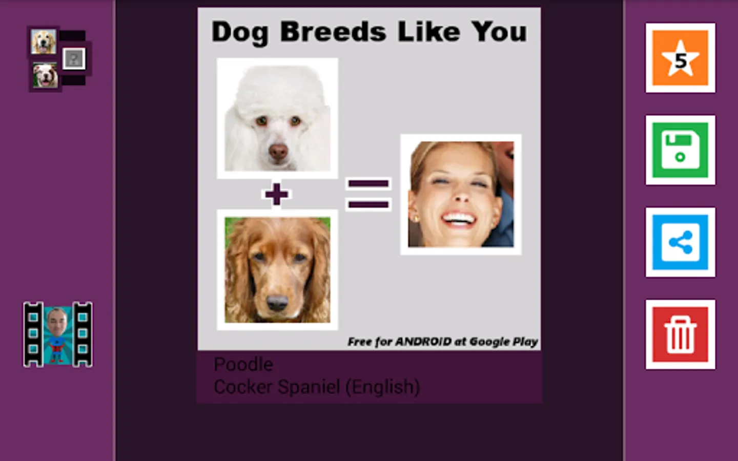 Find out which dog breeds most look like you (look alike)! Upload any photo or picture saved in your cell phone or tablet memory and find out! Select friends in Pictures and share the results on facebook or whatsapp!