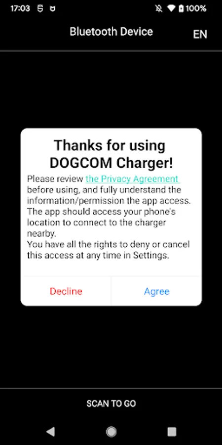 Turn on Bluetooth and launch the DOGCOM Charger APP on your smartphone. The app will begin searching automatically. Click to connect then.