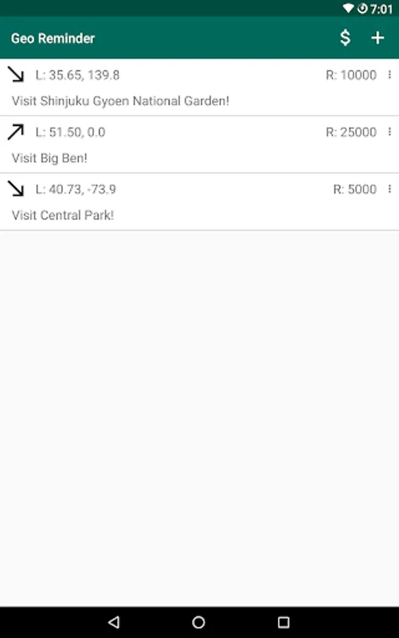Location Reminder lets you set location-based reminders on a map. Once the reminder is set, you'll get a notification whenever you pass nearby the certain place you've selected. Enjoy! :)