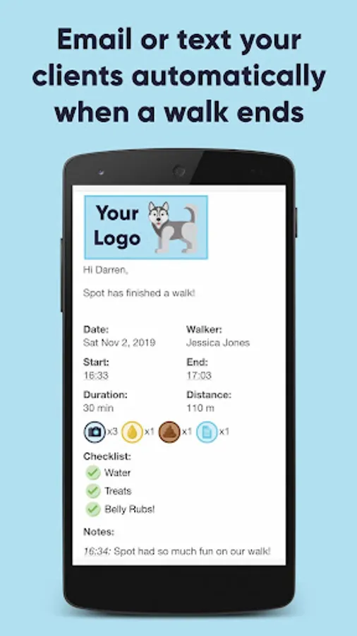 Track your dog walks and automatically email or text the dog owners a summary afterwards! Show them where you went with an interactive map including photos, videos, notes, distance and time. Your dog walk emails can be branded with your own logo and business information.