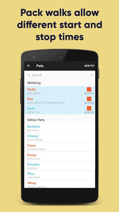 • Group walks with multiple pick ups and drop offs. Each dog's walk time will be tracked individually.
