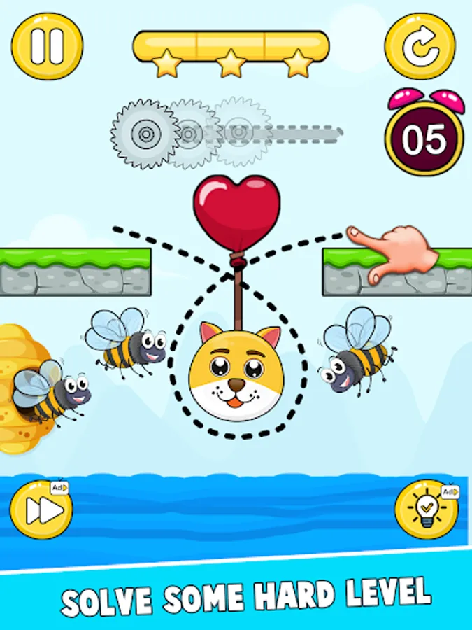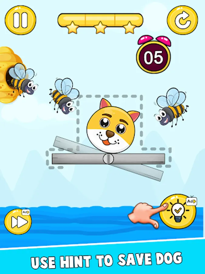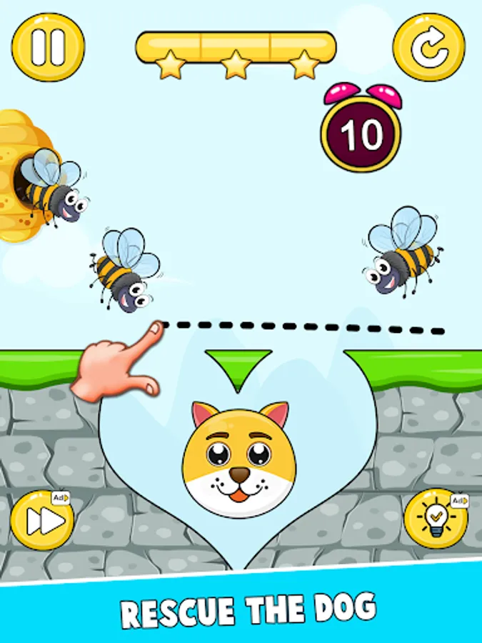Save the Dog: Draw To Save is a draw save puzzle games. You draw one line with your fingers to create walls that protect the Dog from attacks by bees in the hive. You need to draw to save the cat with the painted wall for 12 seconds during the attack of the bees, hold on and you will win the game. Use your brain to save the Dog.