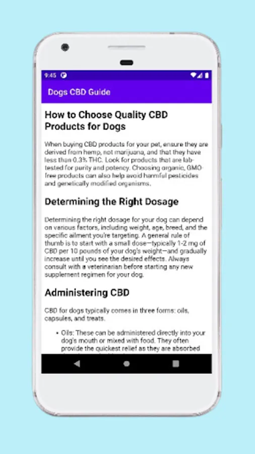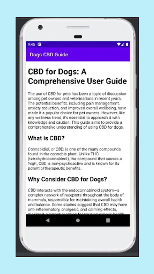 This app provides a comprehensive guide on using CBD for dogs. It covers CBD, its potential benefits for dogs, choosing high-quality products, determining the right dosage, understanding and administering techniques. The guide also discusses how to monitor your dog's reaction and possible side effects, emphasizing the importance of consulting with a veterinarian to ensure CBD is a safe option for your furry friend.