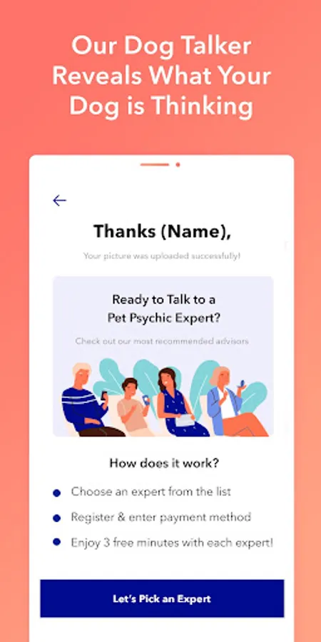 Our Dog Talker app is simple and easy to use. Gain a deeper understanding about your dogβs behavior, thoughts and emotions through animal communication using our expert pet reader. Simply download the app, upload a photo of your dog for our experts, and talk to an online gifted pet psychic and have all your questions answered. Your first 3 minutes are FREE!
