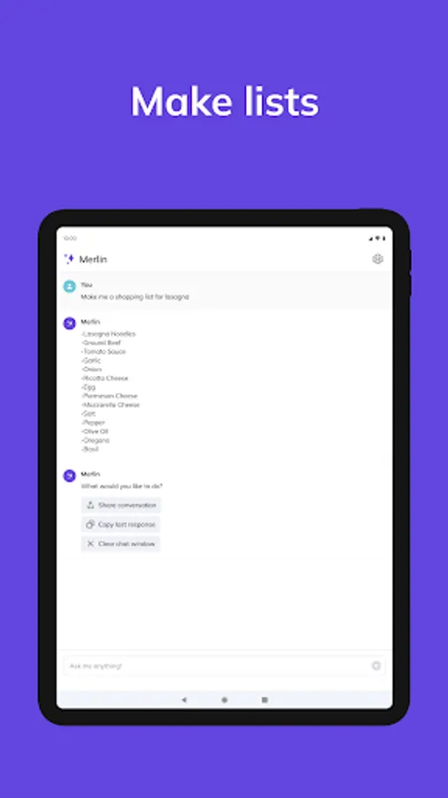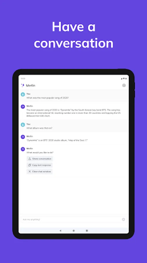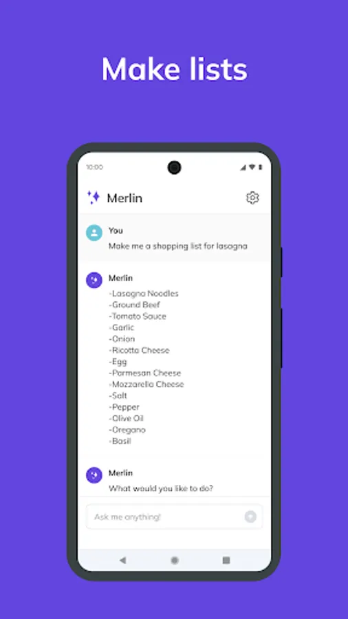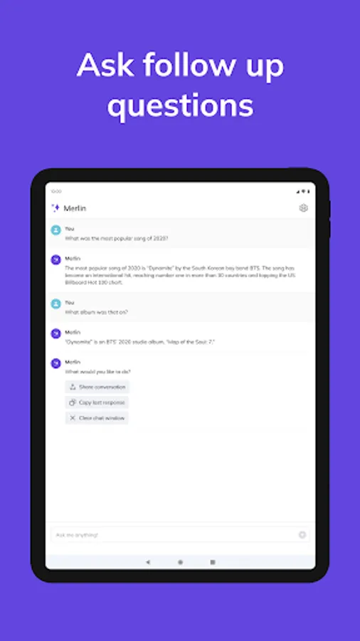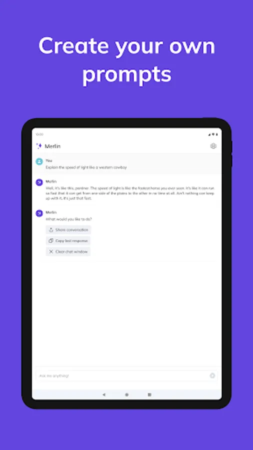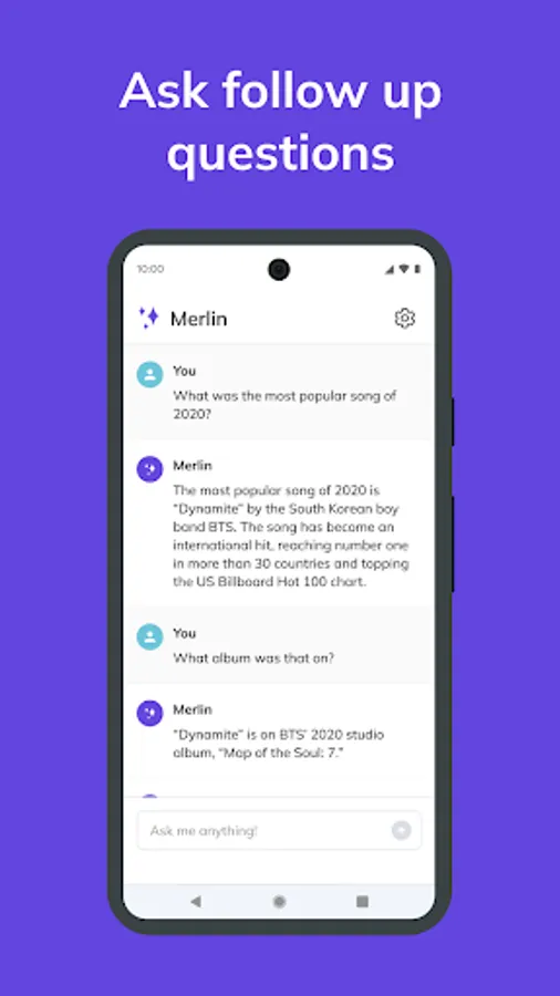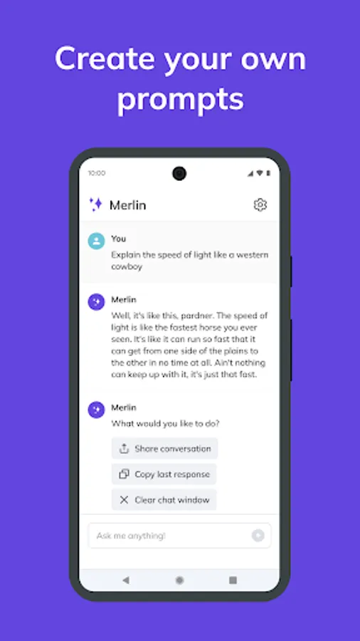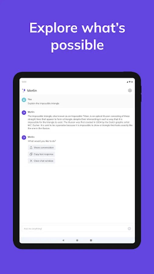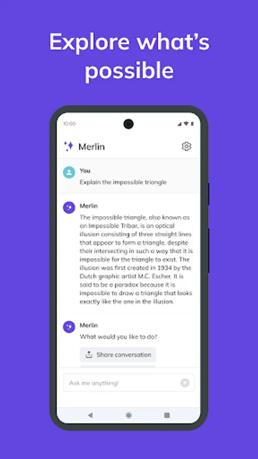 Ask Merlin anything! Merlin is the world's most powerful AI Chatbot. The AI-powered chat bot allows you to engage in virtual conversations, find answers to the world's most complex questions, create captivating stories as well as speed up your productivity to new heights. Merlin AI is integrated with the "Davinci" AI model, the most powerful LLM conversational AI chat technology.