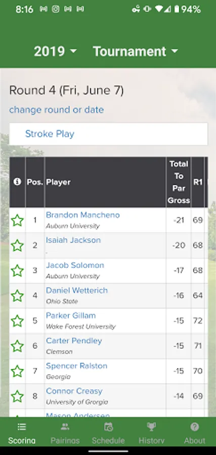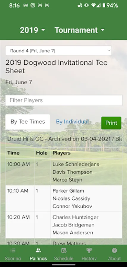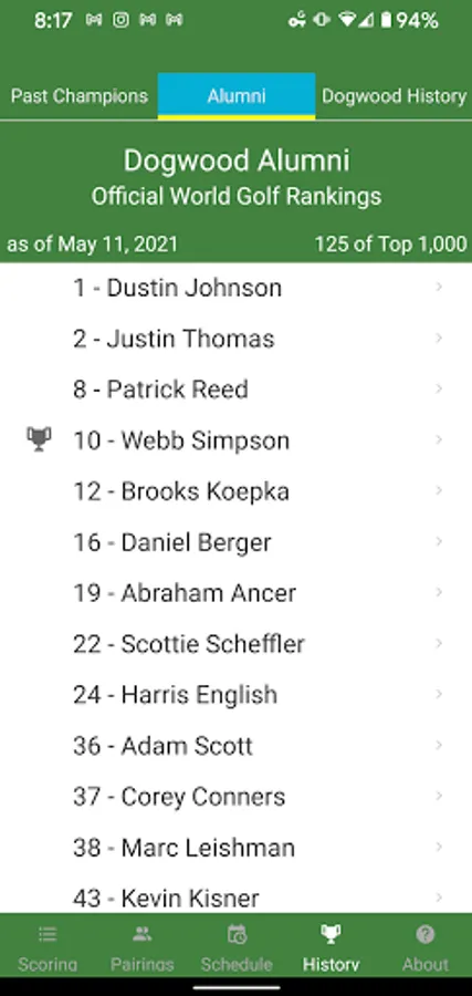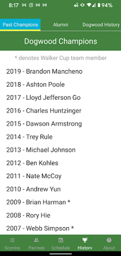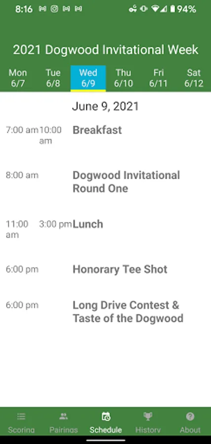 The Dogwood Invitational App is a mobile application that can be used to track your favorite players on the leaderboard, browse a schedule of events, see past Dogwood champions, and engage socially with other tournament players and spectators.