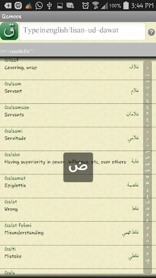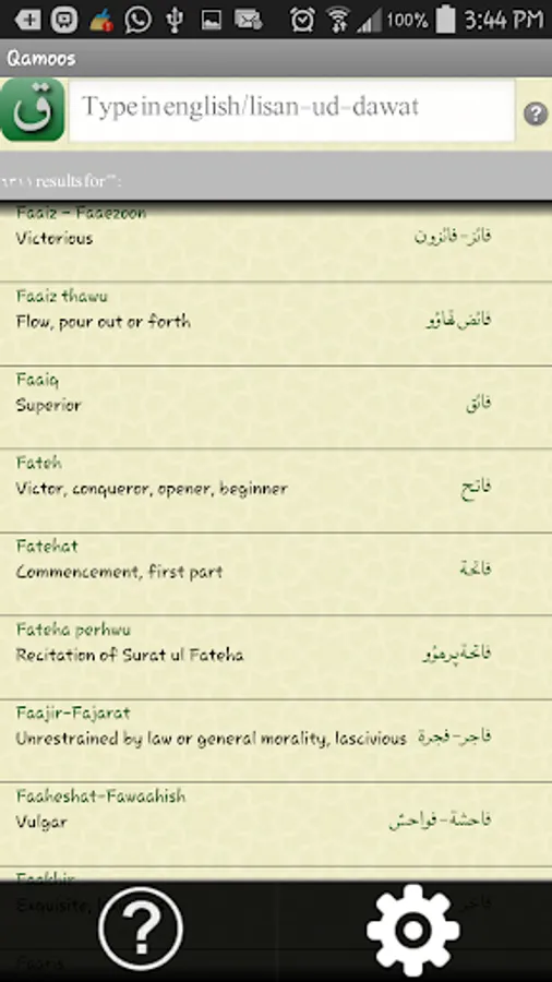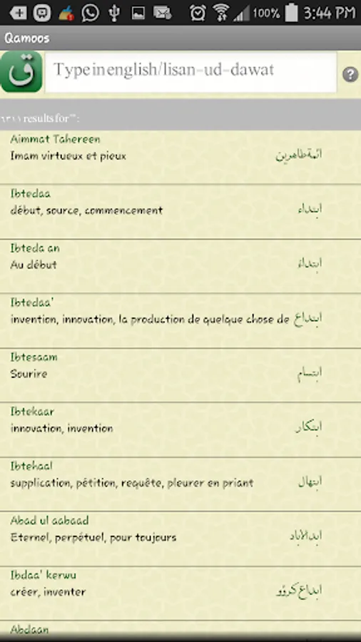 Qamoos lets you easily search in Lisan-ud-dawat, English and French for the words or the meaning and get its translation.