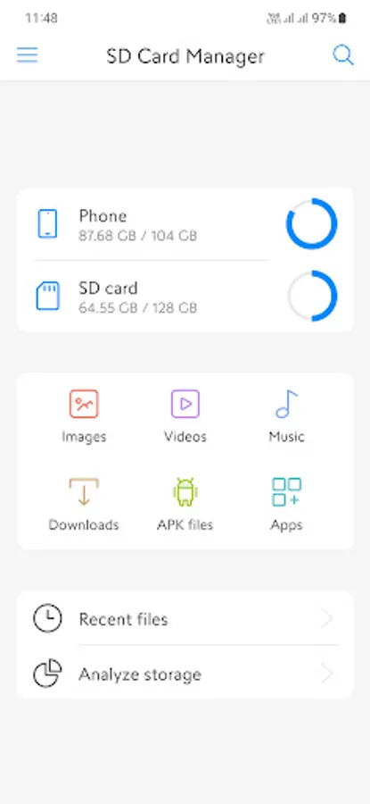 SD Card Manager is a complete tool to manage memory cards and device internal storage. It allows you to browse SD Card, read all files on device, search for files, create folders, create files, copy files, move files, rename files, view file info, share or delete files.