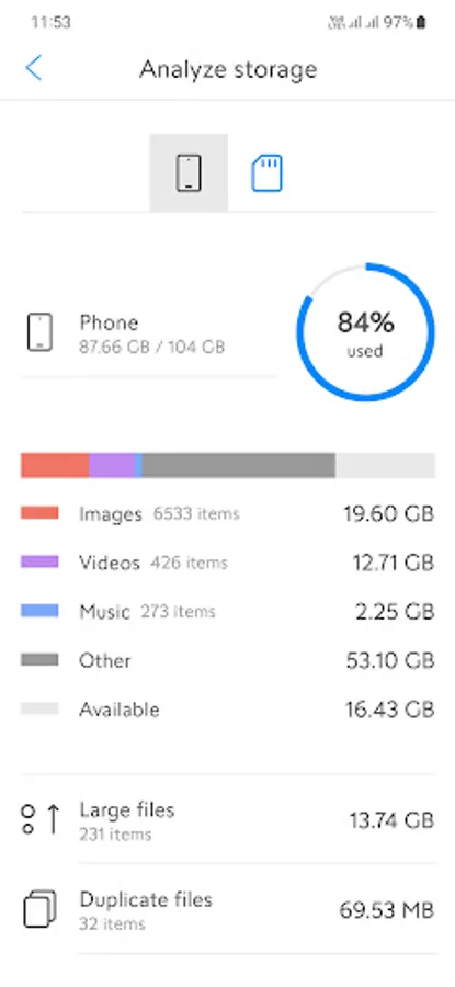 Besides, this application also supports advanced features including: photo manager and viewer, video manager, video player, music player and manager, download manager, manager APK files, application manager, browse recently added files and analyze storage.