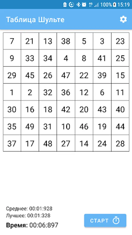 During the exercise, make sure that your gaze does not run over the cells, but is “fixed” in the central part of the matrix. The goal of training with Schulte tables is not just finding numbers in order at a time, but developing the skill of concentration, improving short-term memory, and expanding the angle of visual coverage. You need to focus your gaze on the central part of the table with numbers and try to simultaneously expand your field of view so that in the periphery the numbers from the top left and right and bottom left and right become visible.