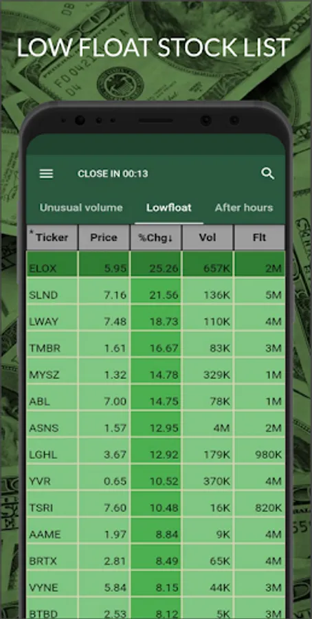 Realtime stock scanner also have low float stock list(Stocks with shares float less than 10mln shares) which