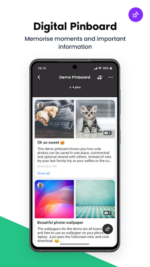 - Save notes and moments in your new digital pinboard and share them with your partner, family or friends