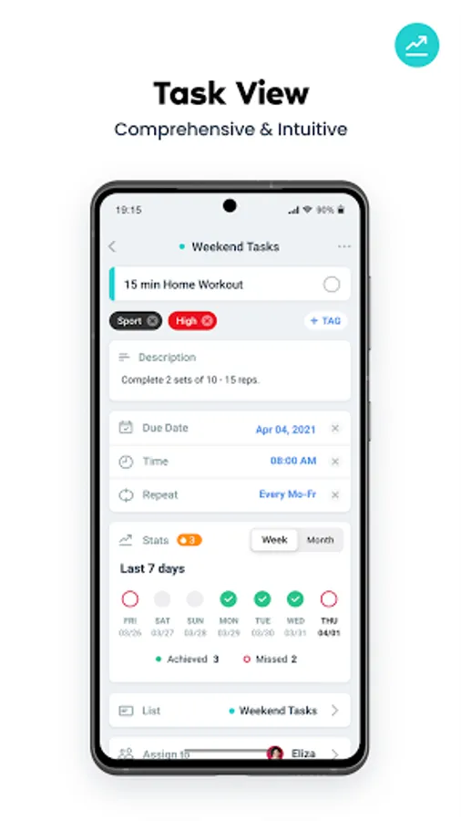 - Track your progress with streak labels and statistics for recurring tasks like „Daily meditation“ or „15min sports a day“