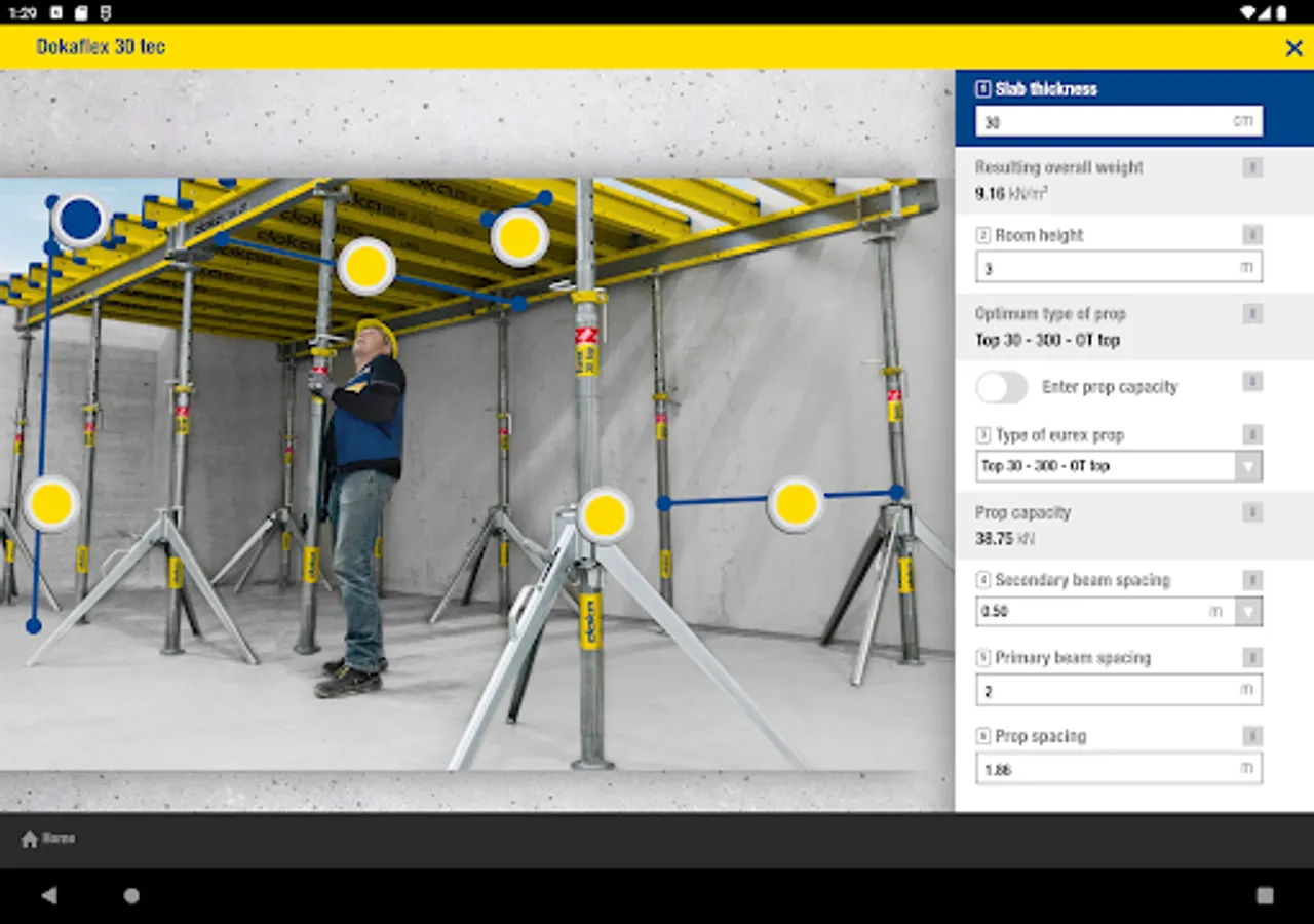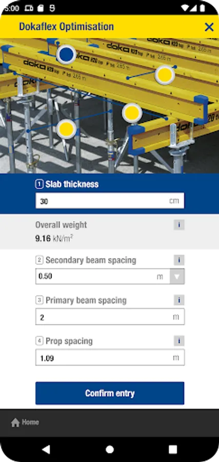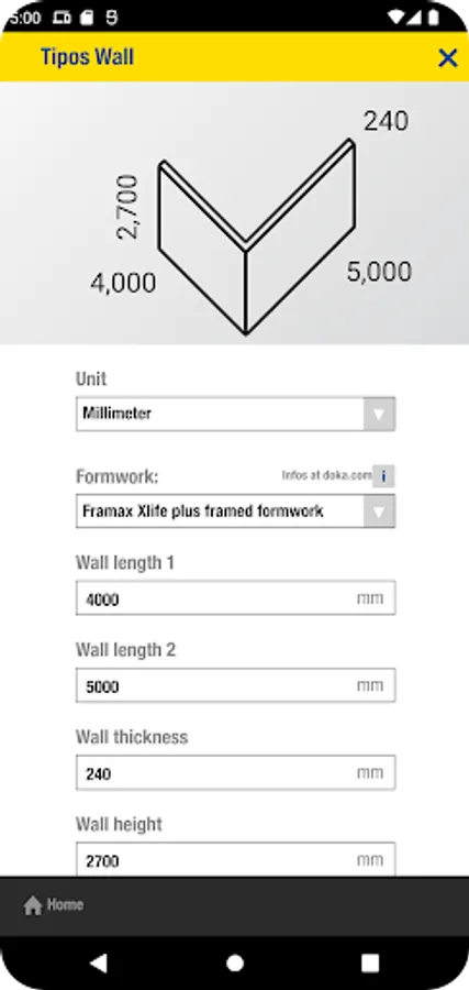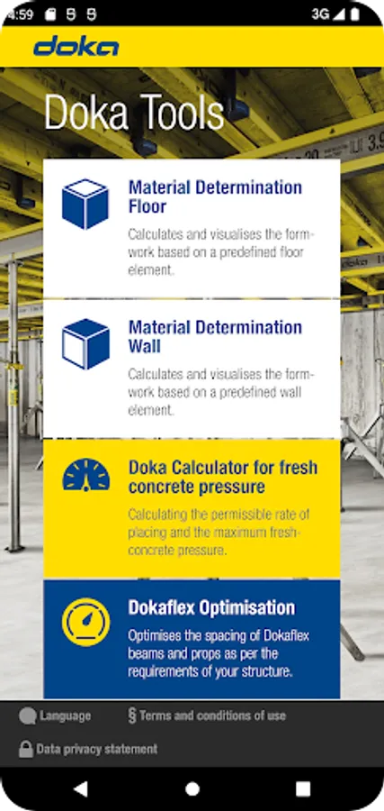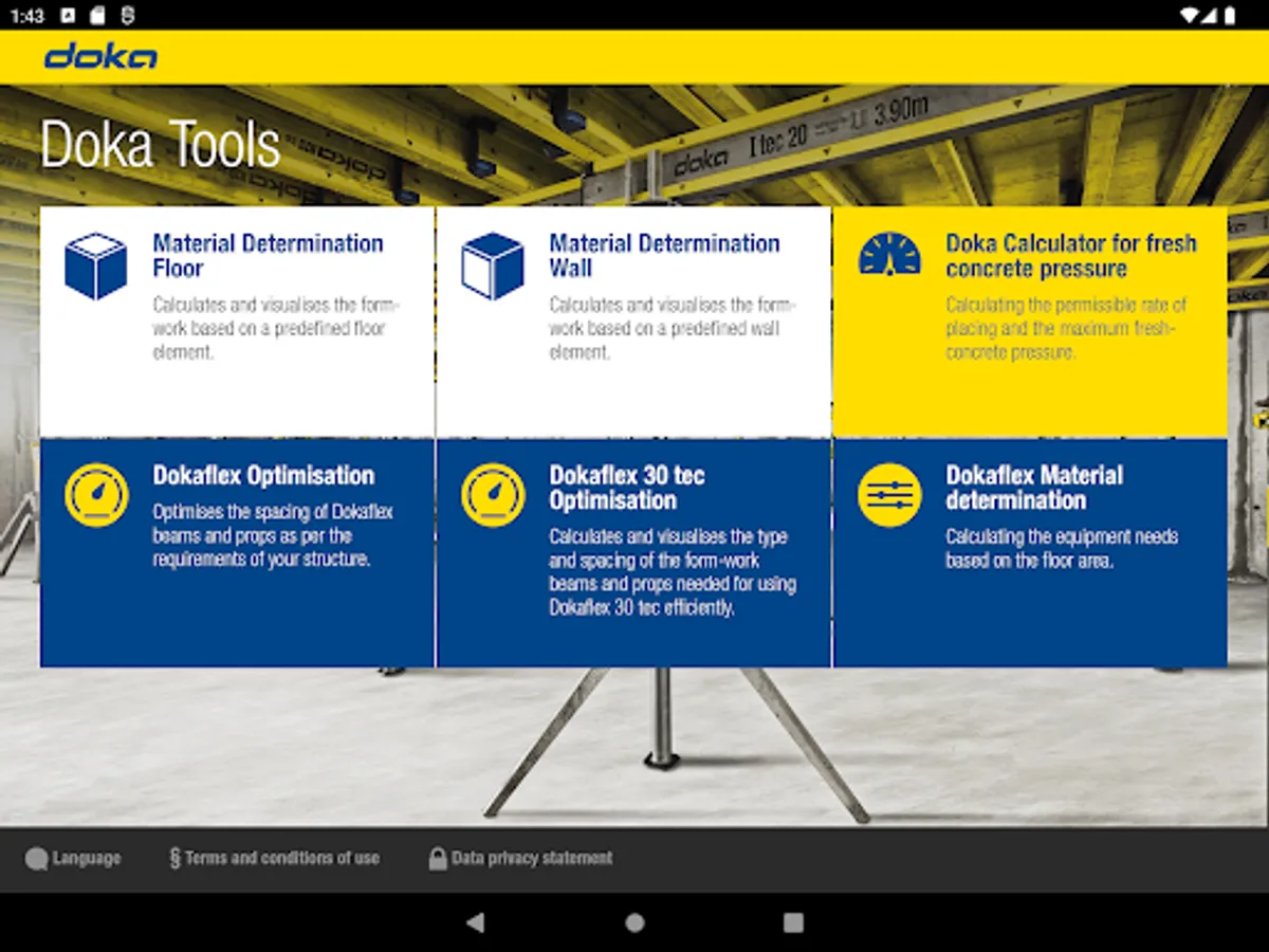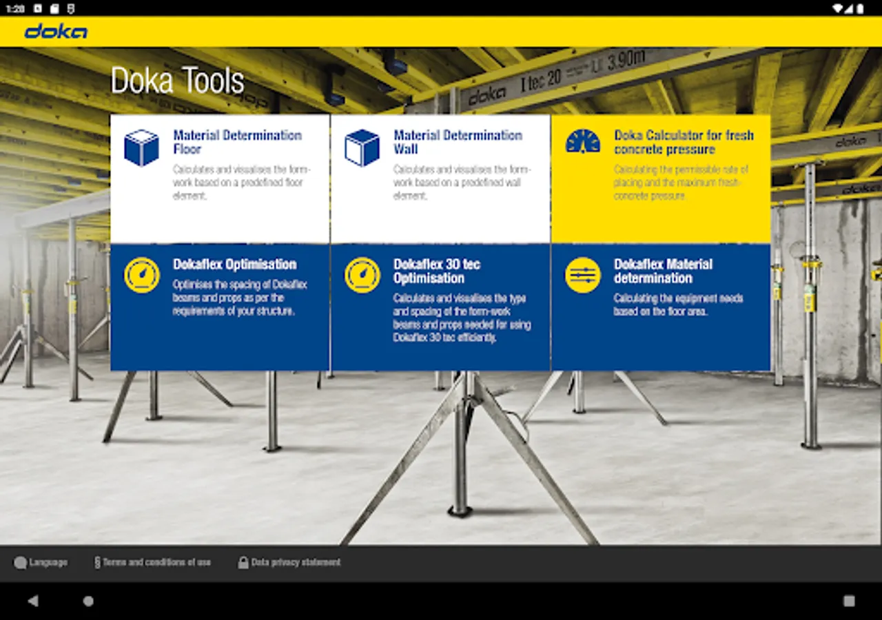 The Doka Tools app is a digital calculation tool for your site. Time-consuming, labour-intensive methods of calculating the optimum equipment quantities are now a thing of the past. With Doka Tools you can plan wall and floor formwork: it takes just a couple of seconds to optimise the components for Dokaflex and to work out the permitted rate of placing and maximum fresh-concrete pressure during pouring.