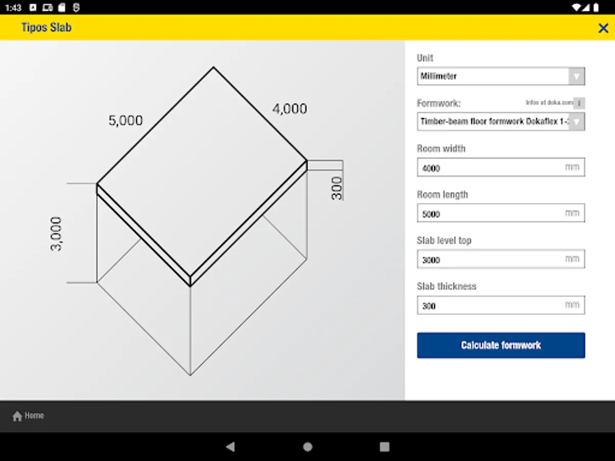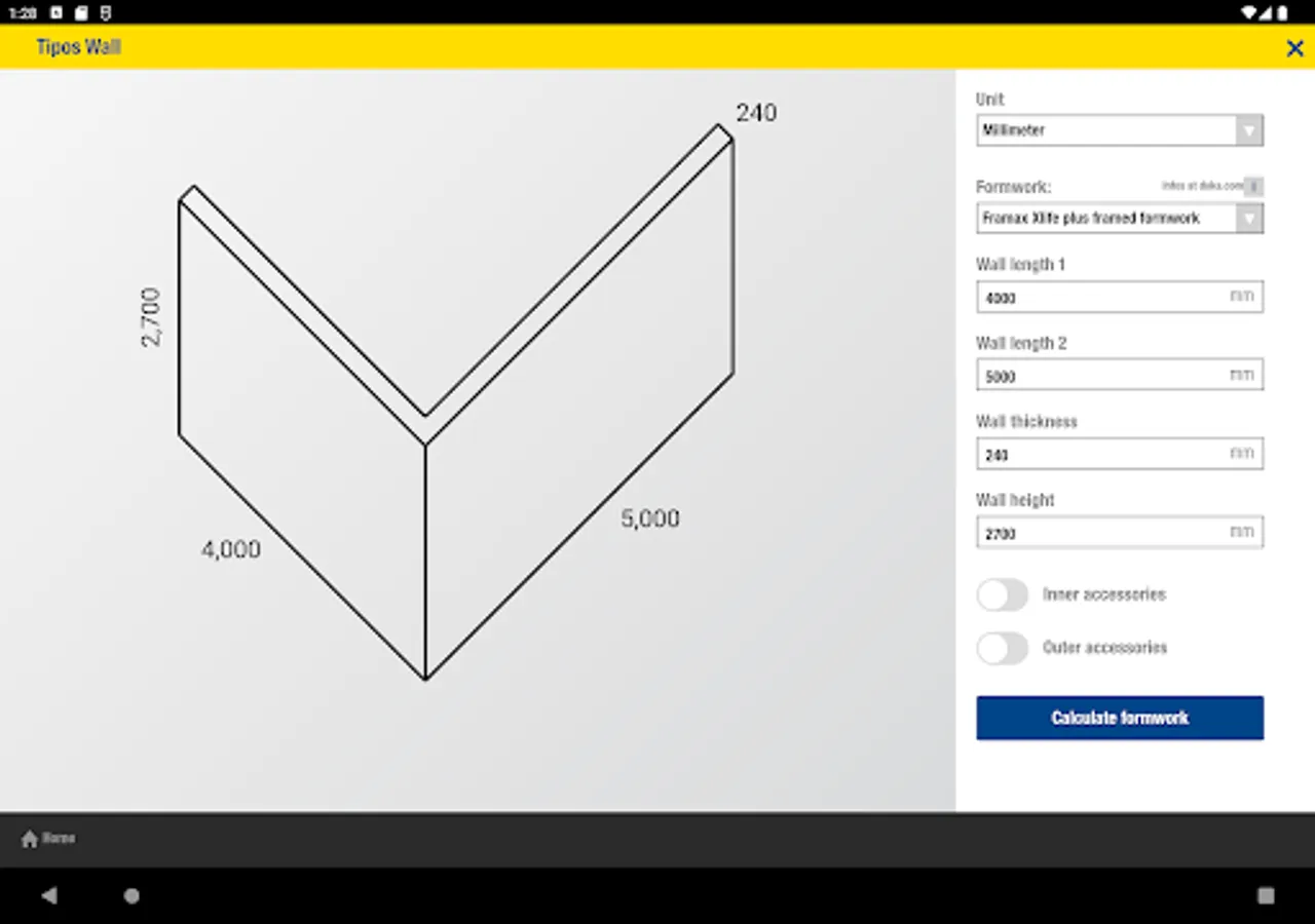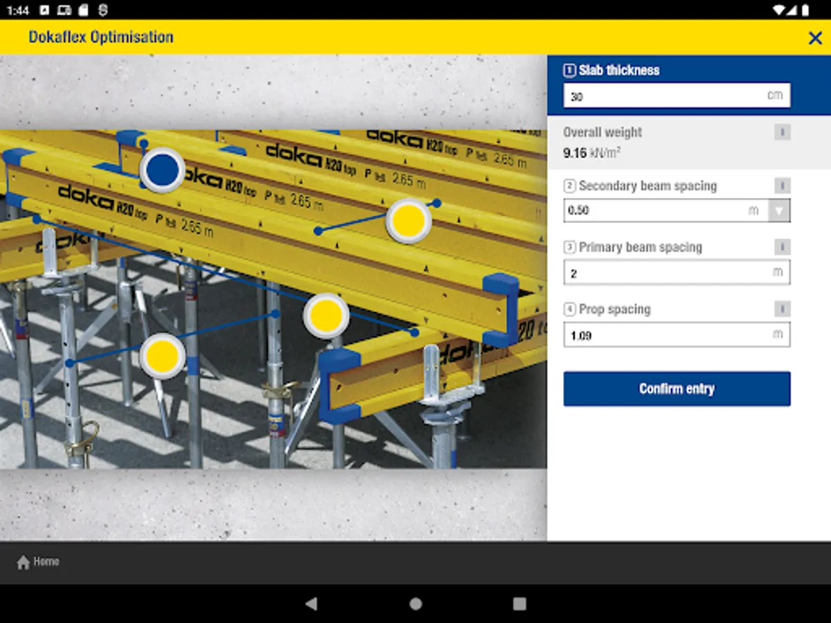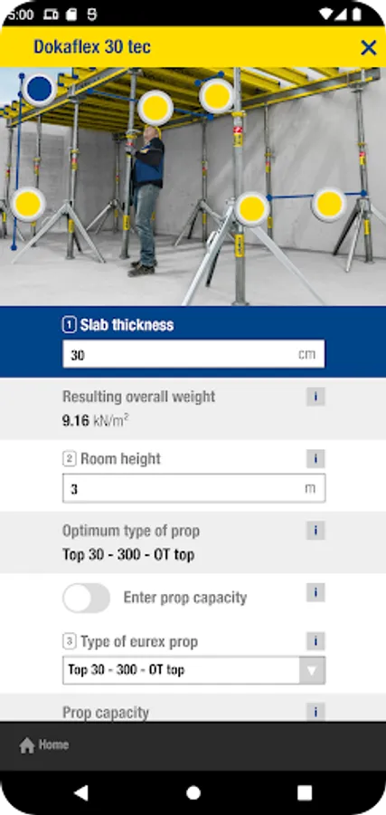 The Doka Tools app is a digital calculation tool for your site. Time-consuming, labour-intensive methods of calculating the optimum equipment quantities are now a thing of the past. With Doka Tools you can plan wall and floor formwork: it takes just a couple of seconds to optimise the components for Dokaflex and to work out the permitted rate of placing and maximum fresh-concrete pressure during pouring.