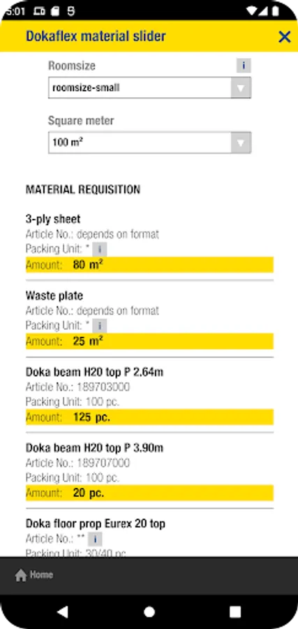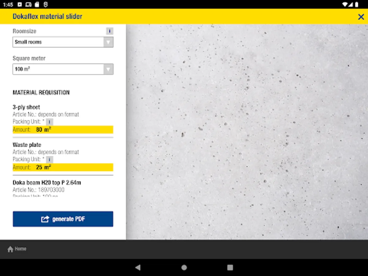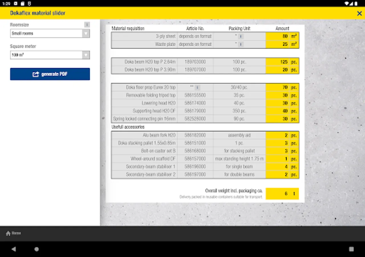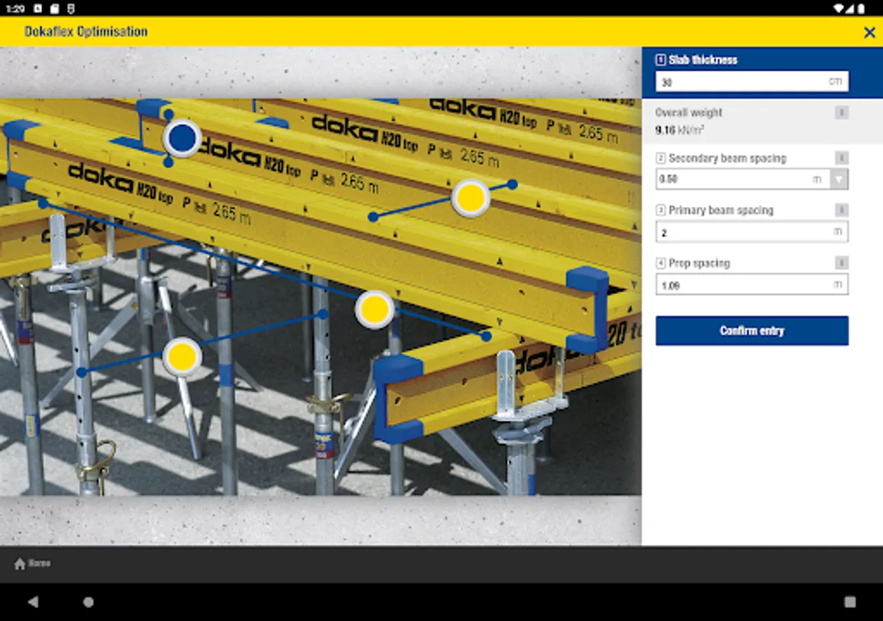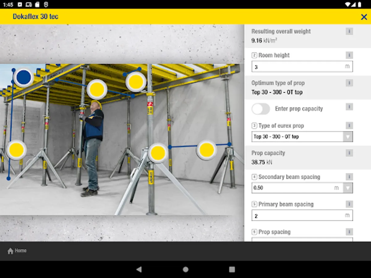 The Doka Tools app is a digital calculation tool for your site. Time-consuming, labour-intensive methods of calculating the optimum equipment quantities are now a thing of the past. With Doka Tools you can plan wall and floor formwork: it takes just a couple of seconds to optimise the components for Dokaflex and to work out the permitted rate of placing and maximum fresh-concrete pressure during pouring.
