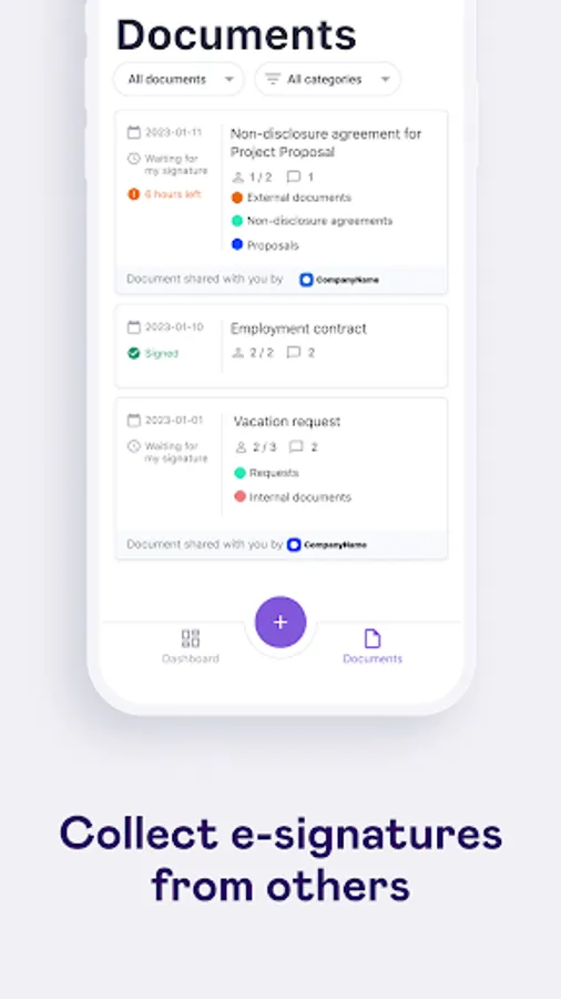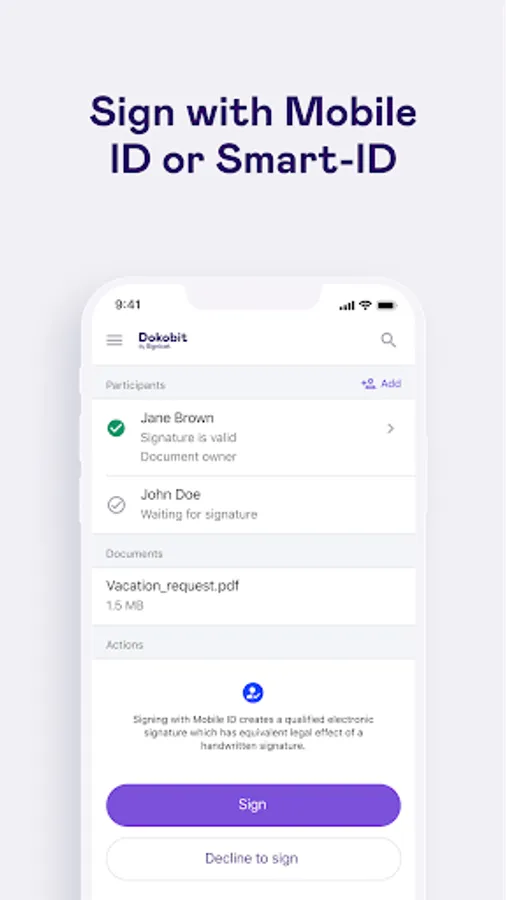Signing documents from your phone or tablet has never been so easy. Dokobit app allows you to sign legally binding documents with Mobile ID or Smart-ID, effortlessly share documents, collect signatures from others and track signing progress anywhere, anytime. Dokobit is an easy-to-use tool where your documents are organised and accessible wherever you are.