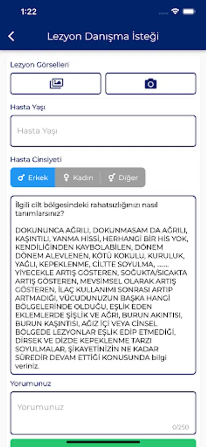 When you click the "Send Lesion Consultation Request" button, you will be able to send 3 good quality photos of your skin problem to our dermatologists who are actively ready to respond in our system. If you wish, you can also upload the image of the lesion using your phone's camera at that time. To whom this lesion you are consulting belongs to, you must enter the age and gender of that person in the relevant section. “How would you describe your discomfort in the relevant skin area?” prepared for your reference. You must express your views in the "Your Comment" box with written expressions as an example in the box or with your own expressions. A nice and detailed interpretation is the most important step in learning about the possible diagnosis of your disease, what needs to be done and, if possible, its treatment.
