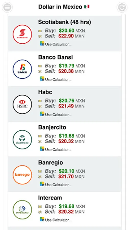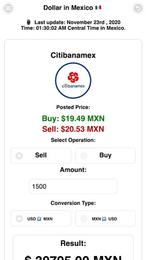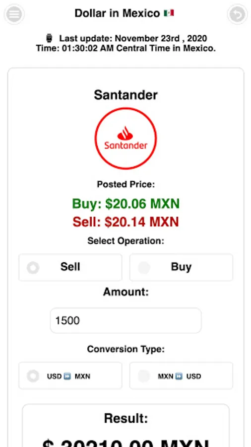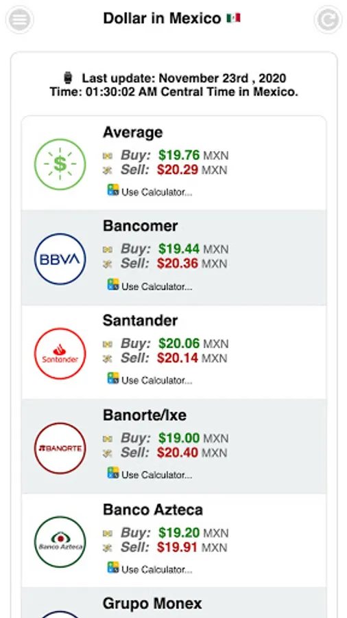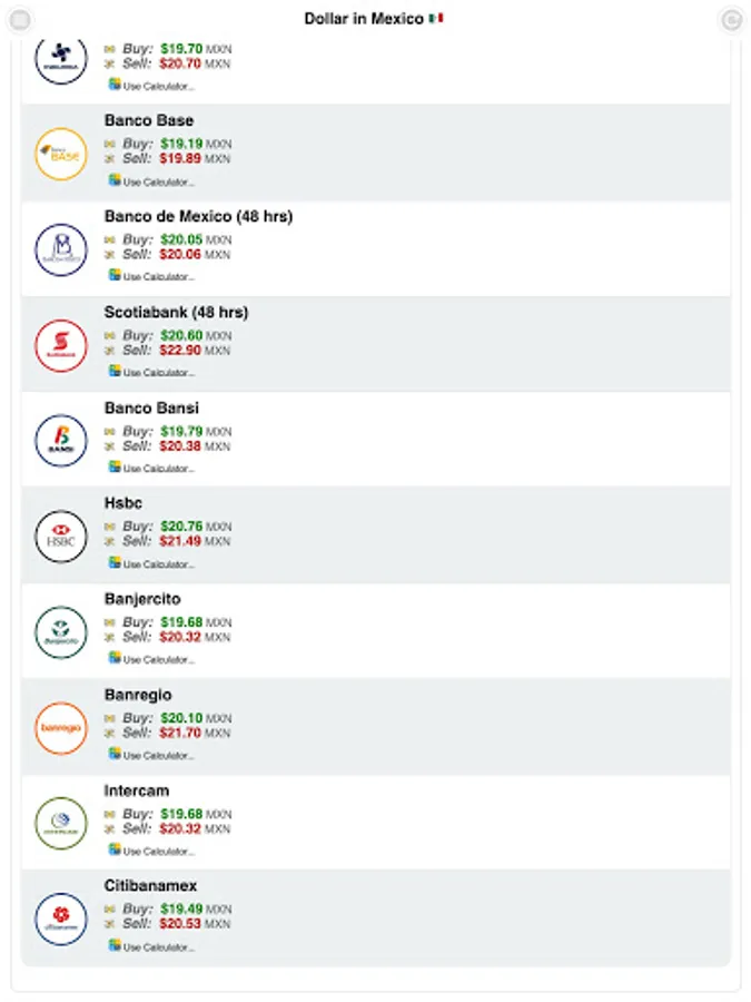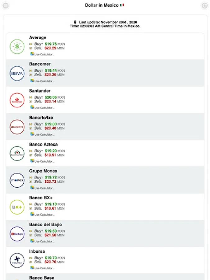 Dollar in Mexico - This application shows the price of dollar, to buy and sell in the following banks in Mexico: Banamex, Santander, Monex, Banjercito, Bank of Mexico, HSBC, Banorte, BXPlus, Azteca Bank, Inbursa, Scotiabank, Bajio Bank, Bancomer, Ixe, Banregio.