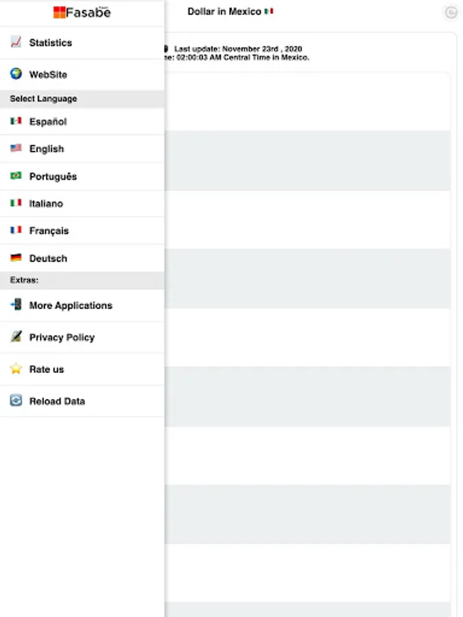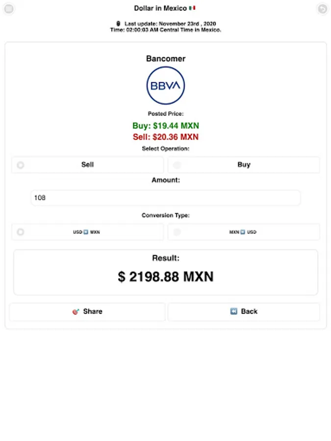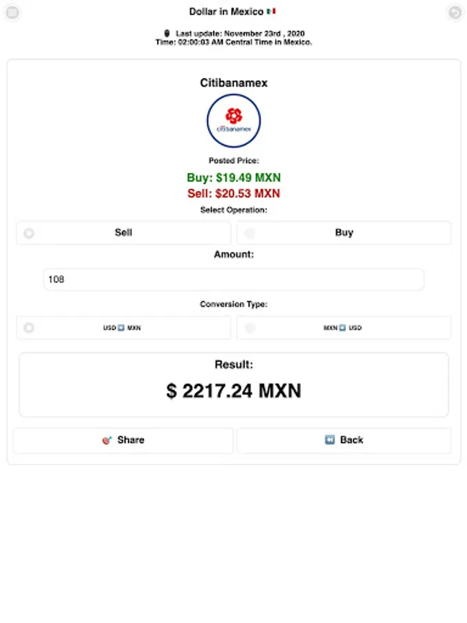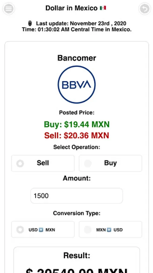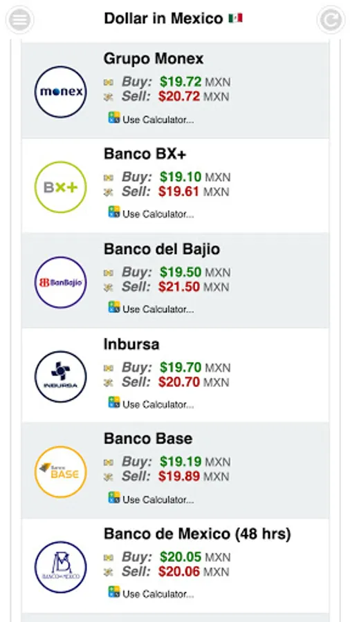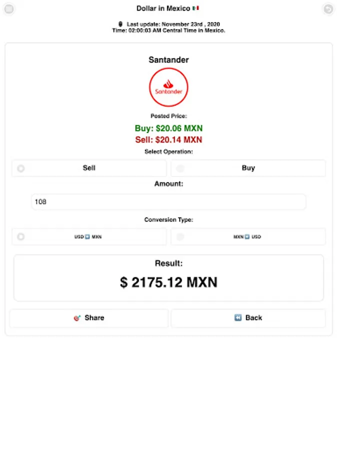 Dollar in Mexico - This application shows the price of dollar, to buy and sell in the following banks in Mexico: Banamex, Santander, Monex, Banjercito, Bank of Mexico, HSBC, Banorte, BXPlus, Azteca Bank, Inbursa, Scotiabank, Bajio Bank, Bancomer, Ixe, Banregio.