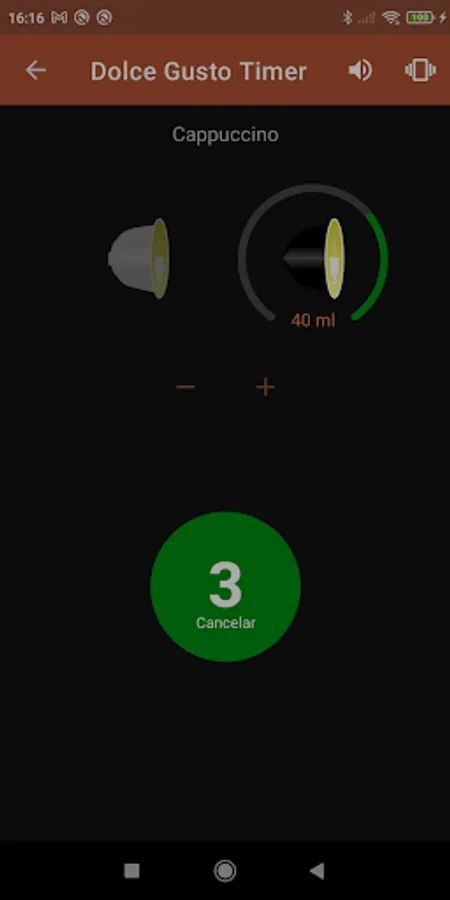 The Dolce Gusto Timer application helps in the preparation of Dolce Gusto beverages in non-automatic machines indicating switching off the machine according to the chosen beverage using an audible alarm and vibrating the device.