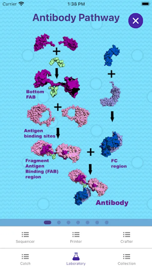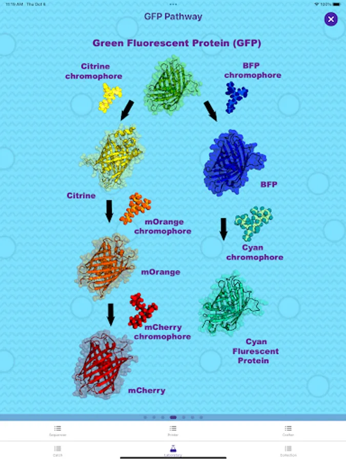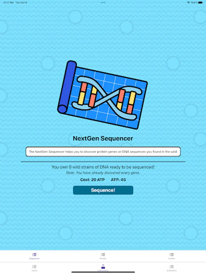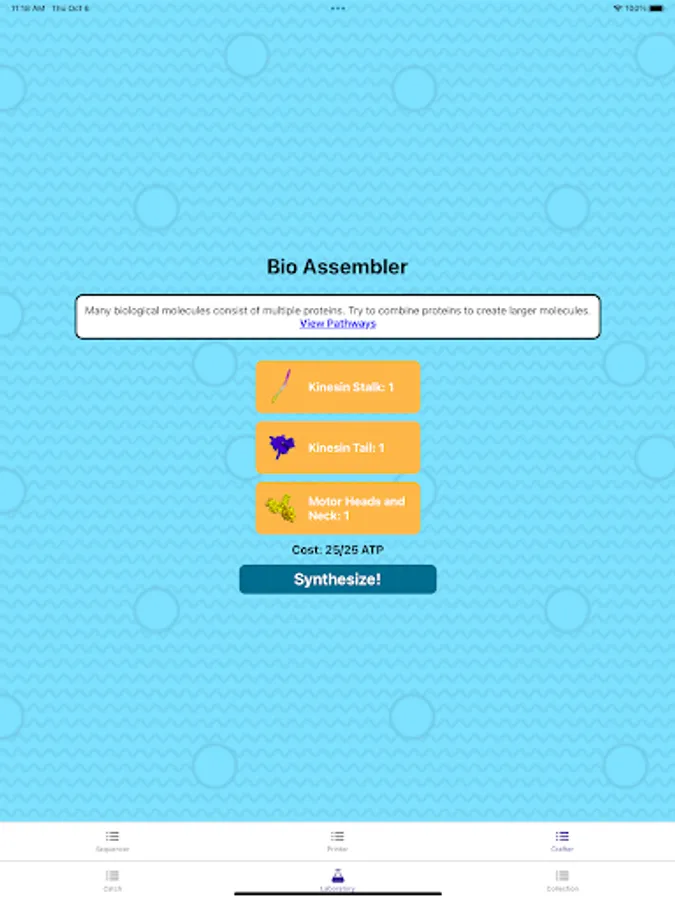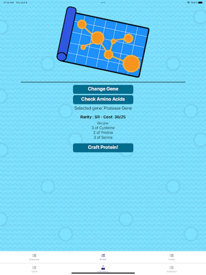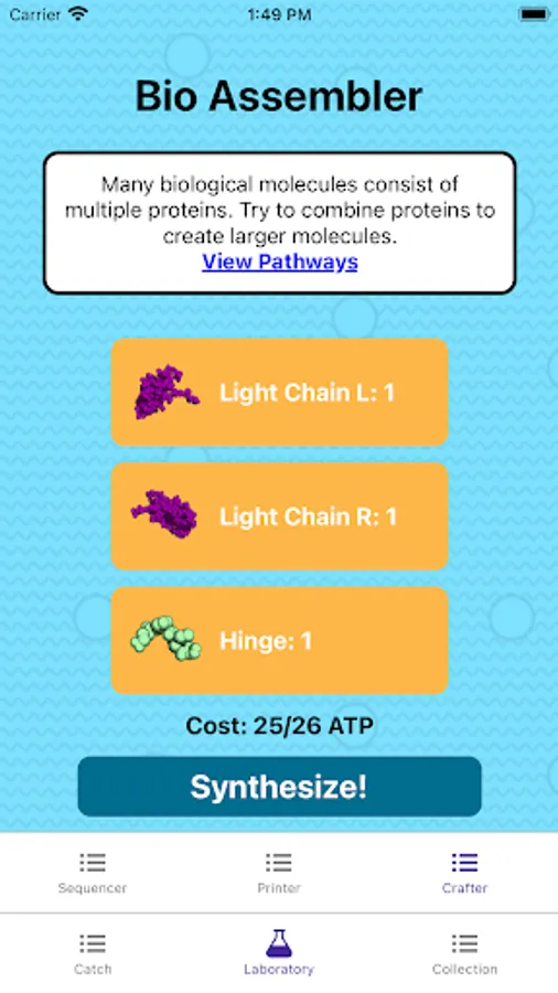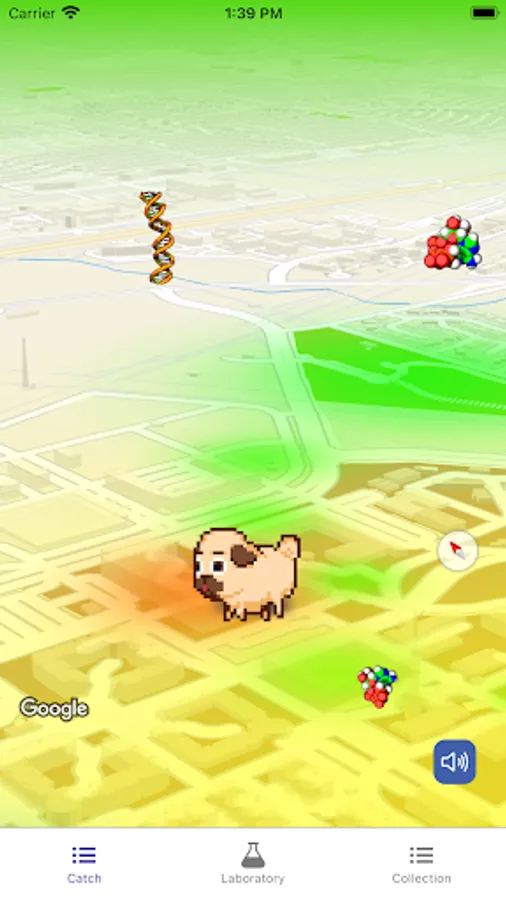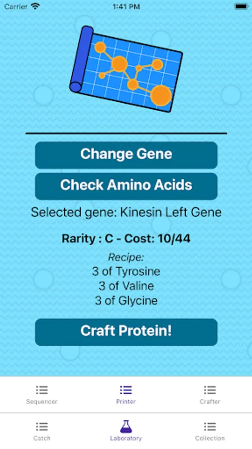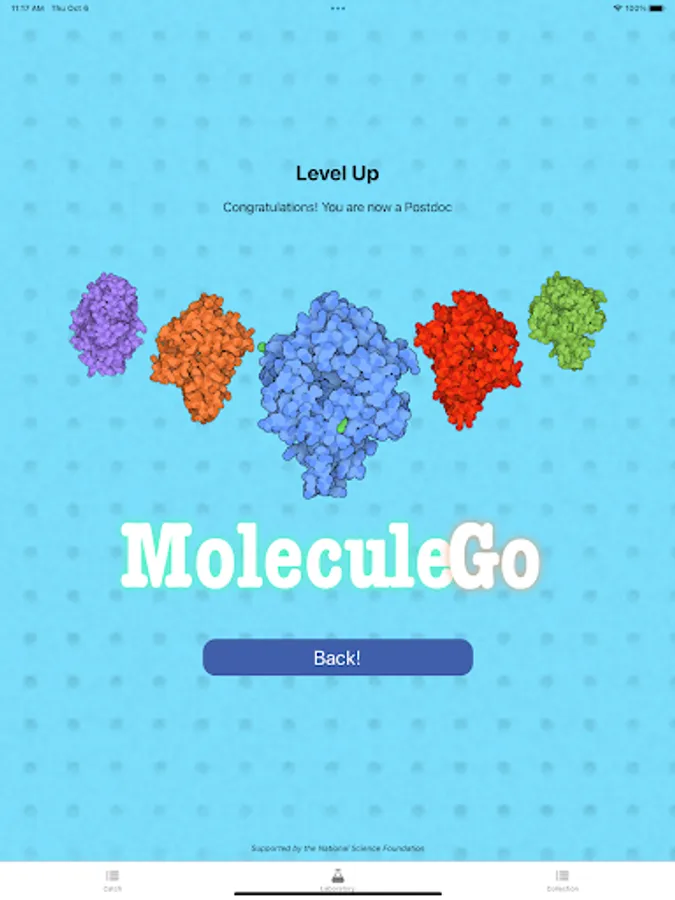 MoleculeGo is a location based app that gamifies the process of learning about molecular biology. In this game, the player collects amino acids, ATP, and DNA sequences, the molecular building blocks used to synthesize proteins. By capturing DNA sequences, the player discovers genes that encode for proteins. These genes provide the user with the necessary "recipe" to synthesize proteins in their own lab, using amino acids and ATP. These proteins can then be combined to construct even larger protein complexes. As the player progresses in the game, new molecules become available and information will become available about each molecule's basic function and how its structure is associated with its molecular role. Players can visit hotspots (schools, parks, hospitals, universities, etc.) to accelerate the discovery of new molecules. While molecules are discovered, players can learn how they are involved in disease, biomedical applications, research, and their function in the cell.