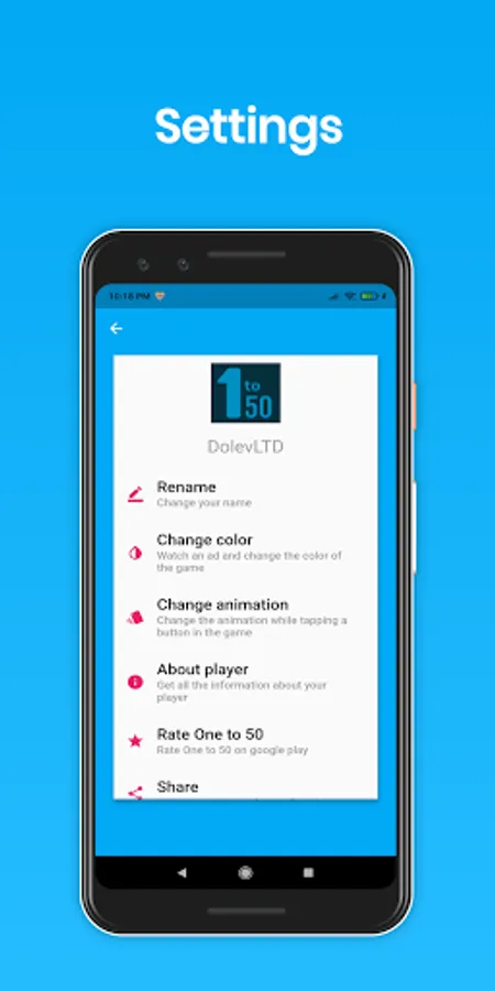 In the setting, you can change the color of the app, change the animation, rename yourself, share the app and rate it.