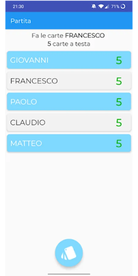Bisca is a card game that took hold at Doli in the summer of 2019. This game can be played by many and for this reason it can be useful to have an application that tells you who has to mix, how many cards it must give and the scores of the various players.