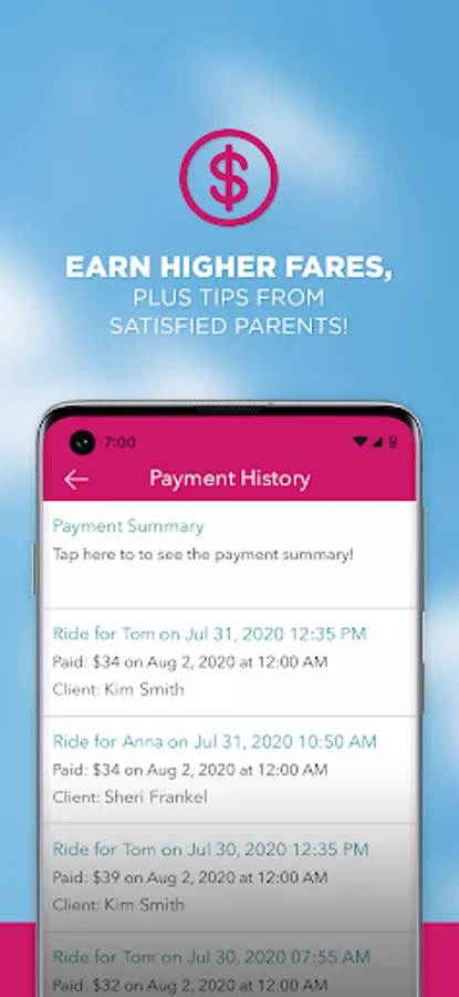 With greater responsibility and experience, comes reward! Earn higher ride fares, plus tips from satisfied parents. Get paid out several times per week, and easily review your earnings in the app at any time.