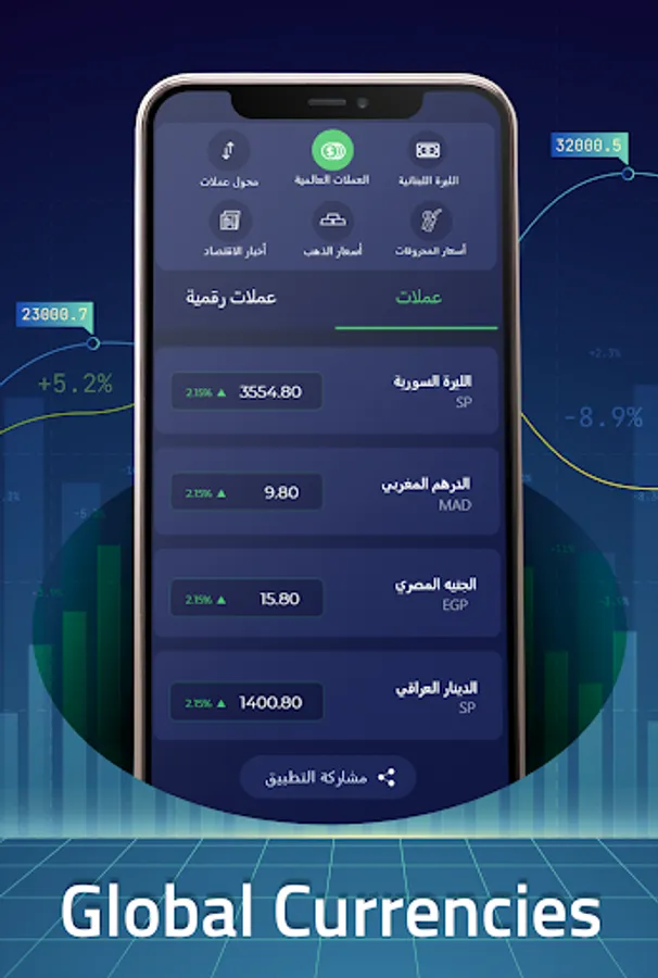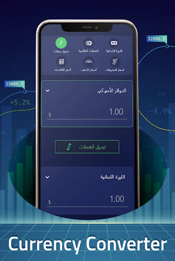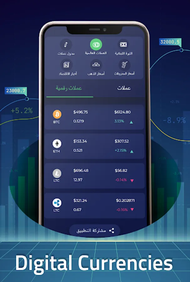 You can convert between currencies and see previous prices, and see the rates of Arab and international currencies and digital currencies.