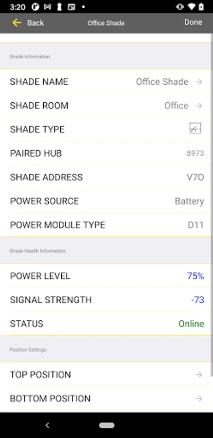 Check the heath of your motorized window coverings at a glance with Battery level + Signal strength icons on your device.
