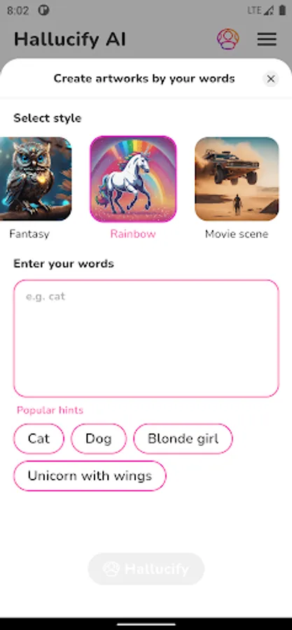 Discover Hallucify AI – the user-friendly app that effortlessly transforms your text into captivating visual art! Elevate your messages, express your thoughts, and engage your creativity with just a few taps.