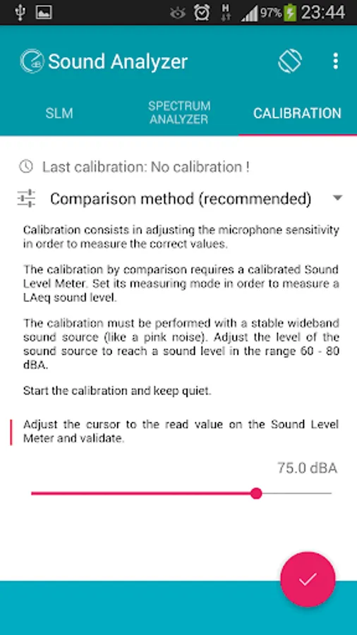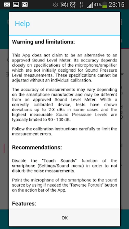 Warning: This App does not claim to be an alternative to an approved Sound Level Meter. The accuracy of the measurements depends closely on the specifications of the microphone/amplifier which are not designed in a smartphone for Sound Pressure Level (SPL) measurements. This App is for indication only or for educational purpose. Use an approved Sound Level Meter where it is required.