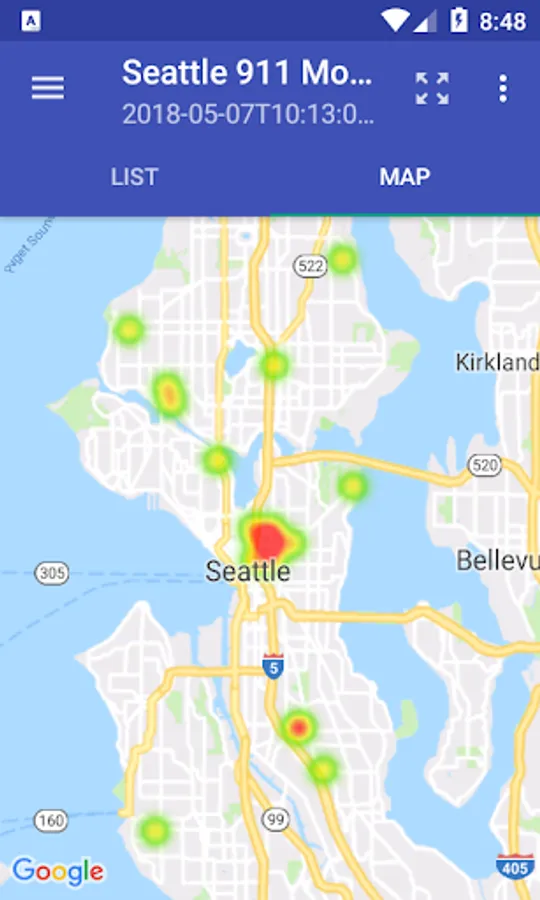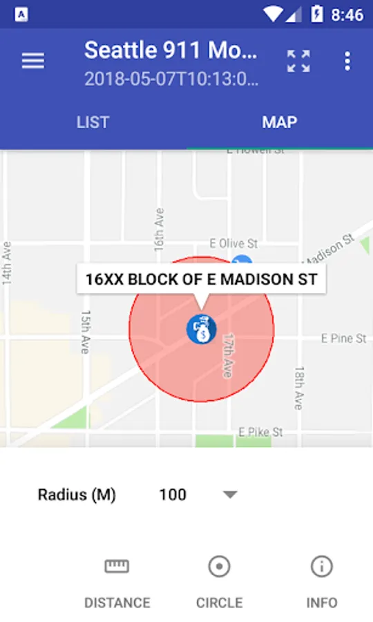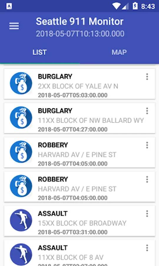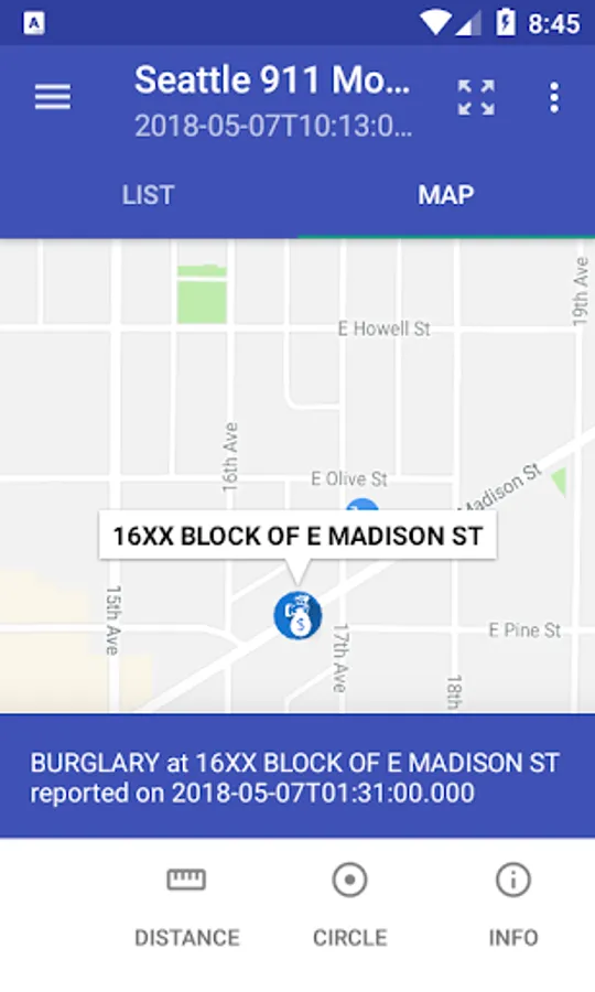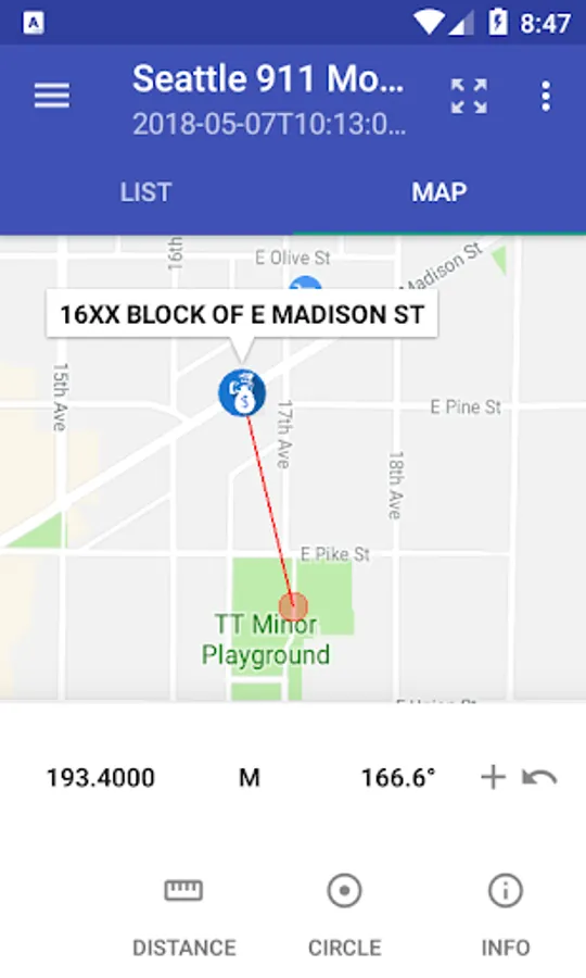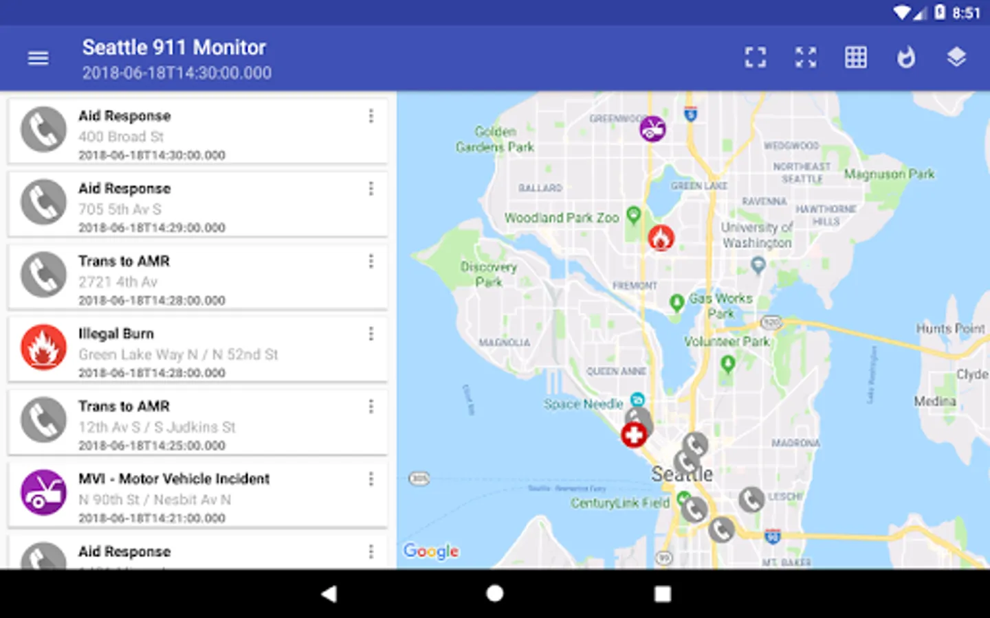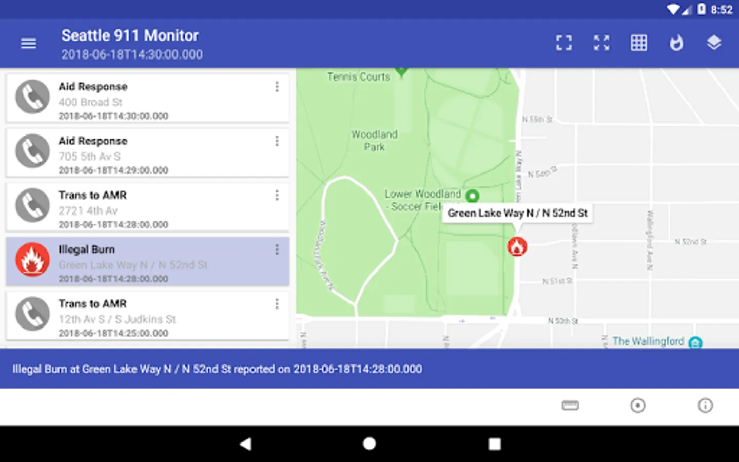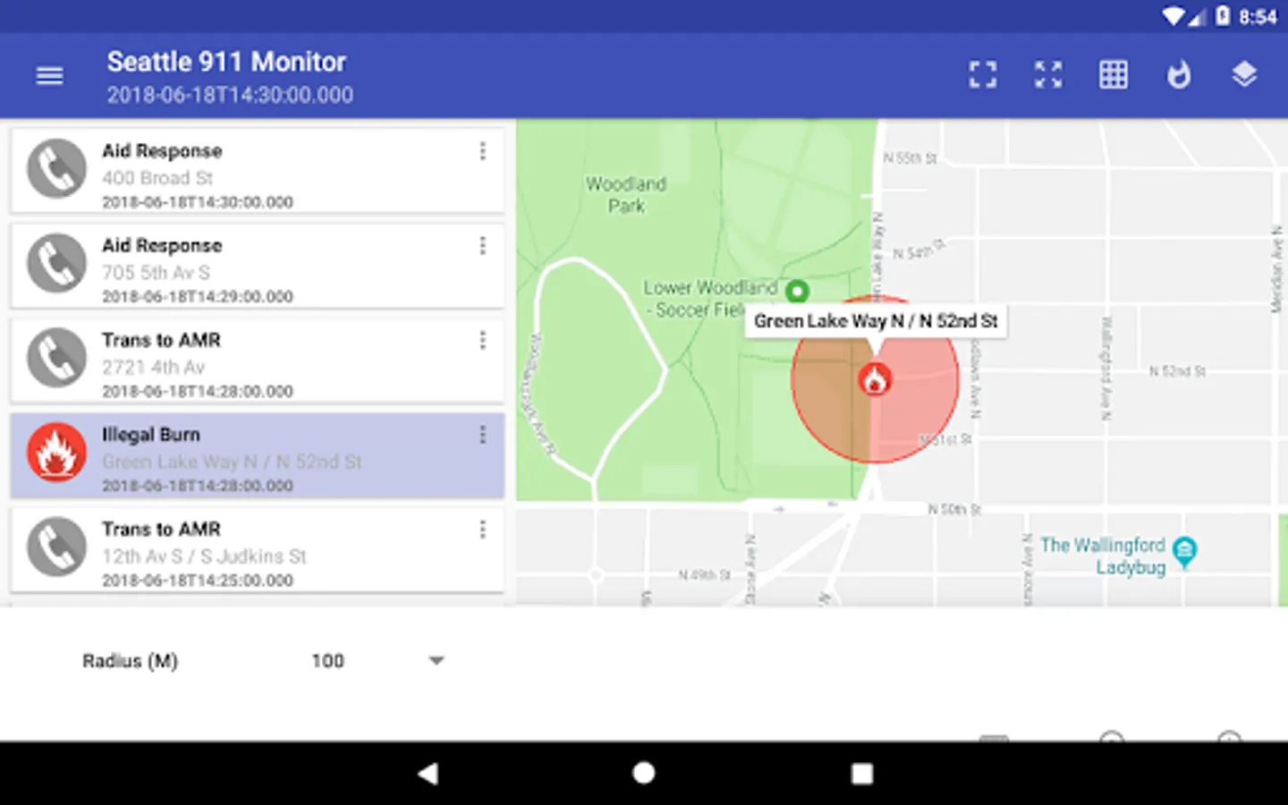 Users can monitor the real time 911 dispatches (updated every 5 minutes), and report incidents (updated within 6 to 12 hours). The incidents can be viewed as a text list or on a map as icons or heat map. Examples of incidents include burglary, accident, fire, assault, drugs, death, and many more. Incident details can be viewed by touching an item on the list or a marker on the map display. A function is available to easily filter incidents by tags from the list or map. The app allows the user to send the incident location to Google Maps for better visualization of the 911 incident environment. Also has functions to measure linear distances and circular buffer zones around incidents.