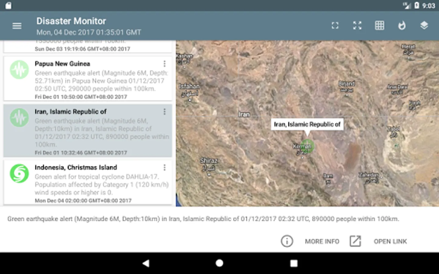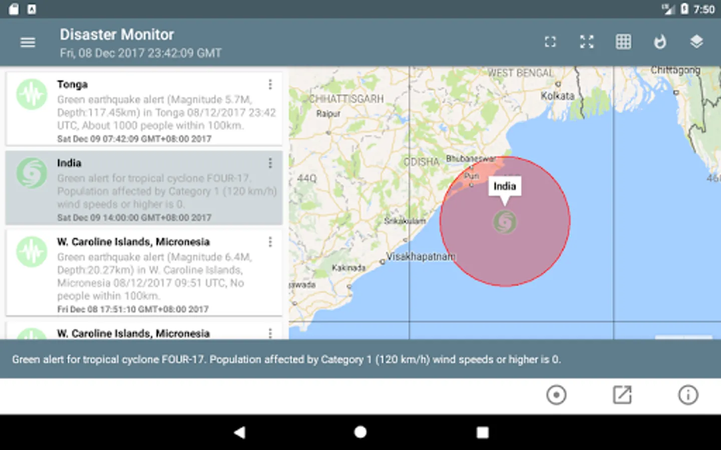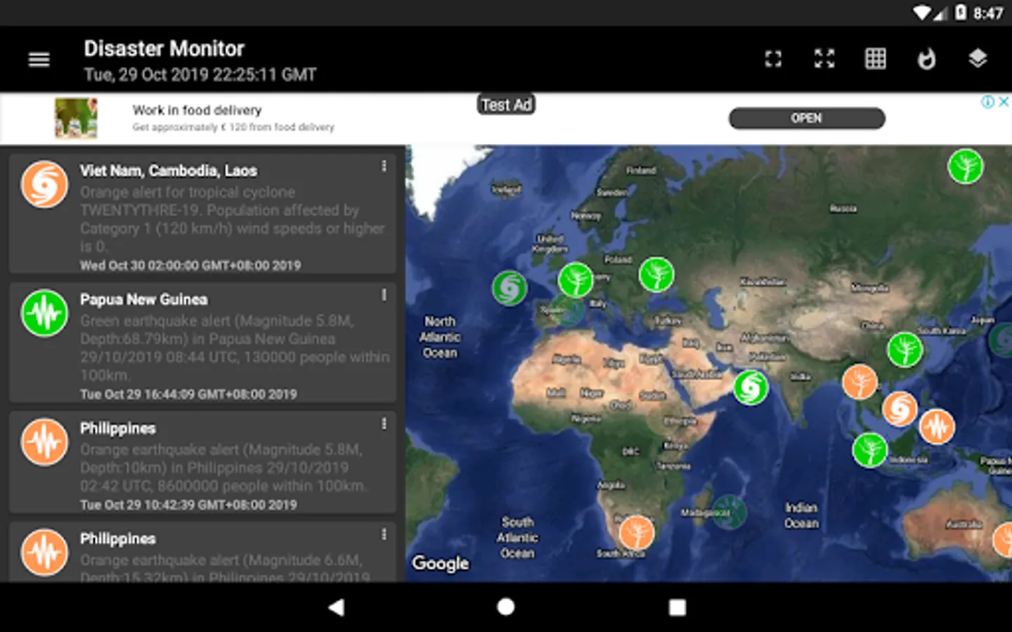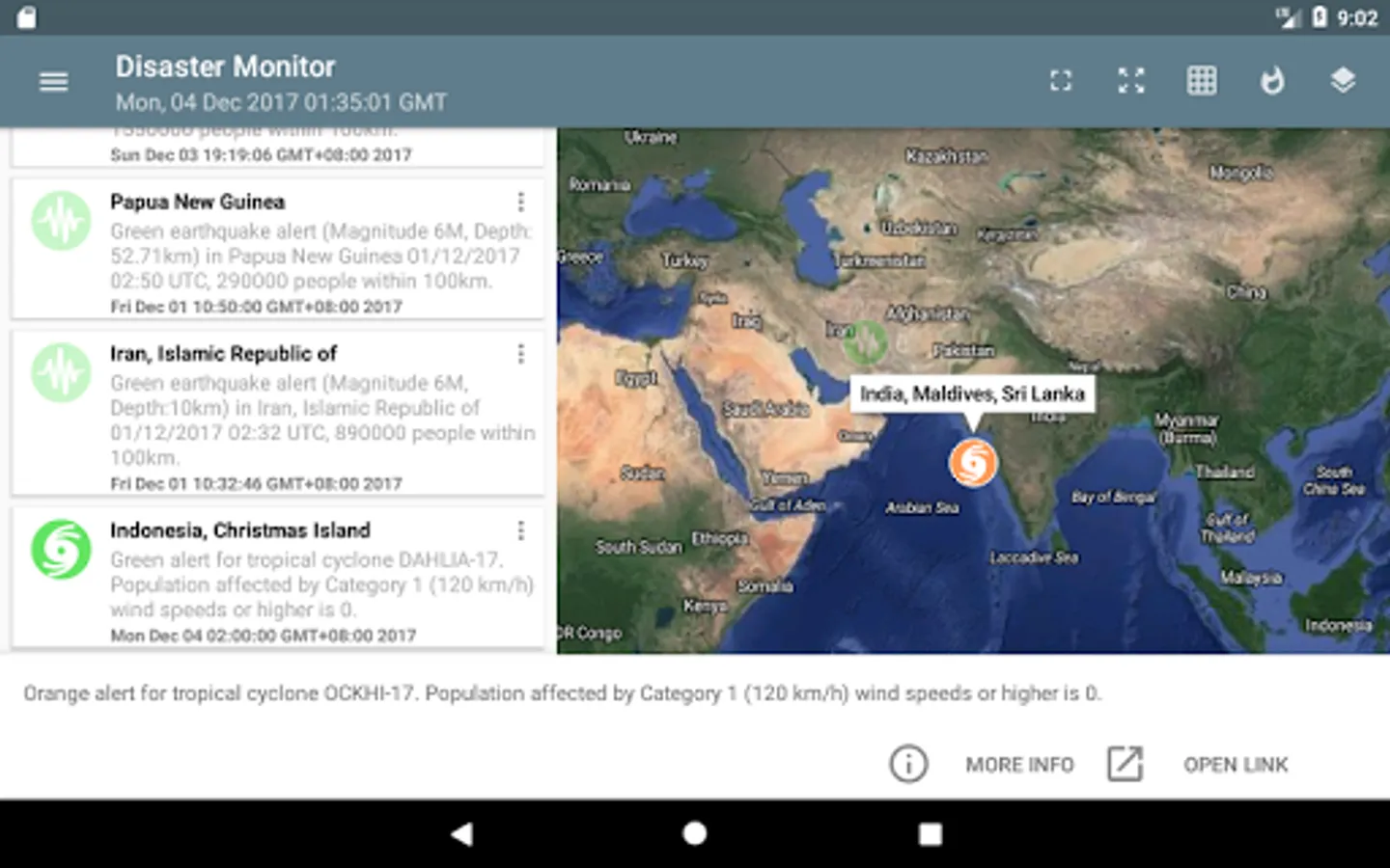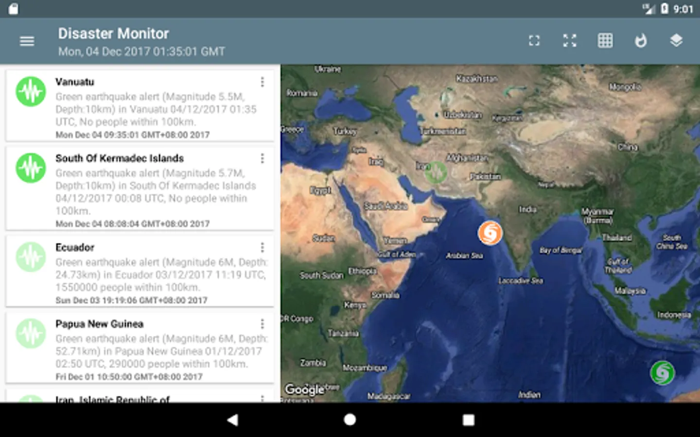 You can monitor natural disasters around the world, as published by the Global Disaster Alert and Coordination System - www.gdacs.org. The app shows the latest natural disasters like earthquakes, droughts, volcano eruptions, tropical cyclones, tsunamis and floods as color coded icons in a list as well as on a Google Maps backdrop; the icon colors indicate the alert level - green, orange, and red. The icon will look more transparent the older the event was published. Clicking on the item will bring up more details about the disaster event. UTM or geographic grids can optionally be displayed on the map.