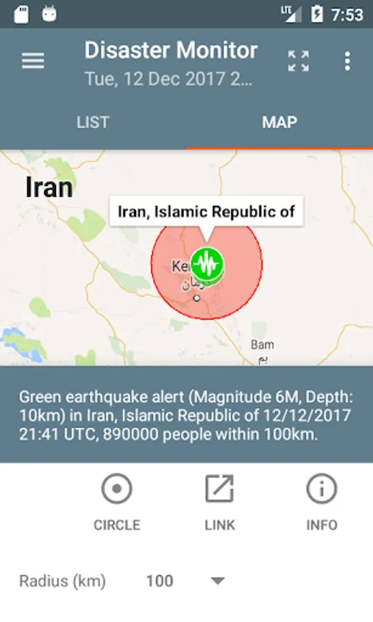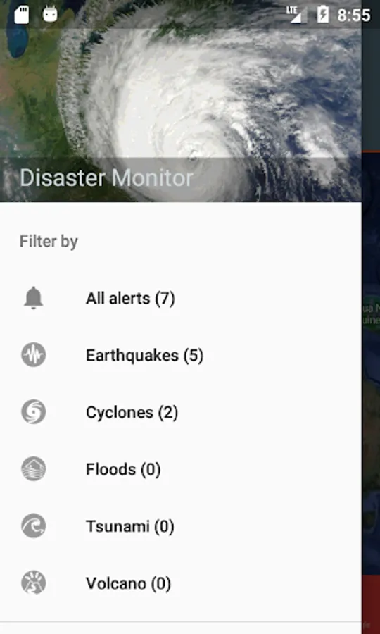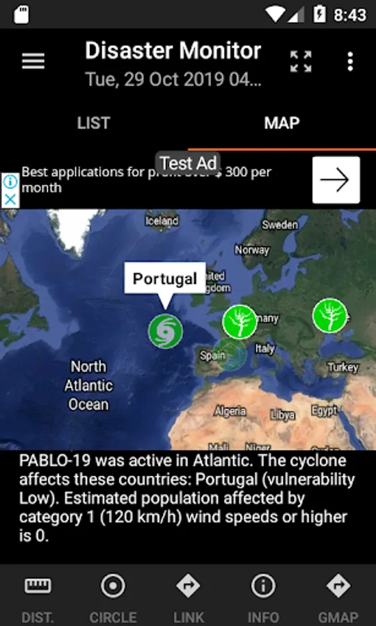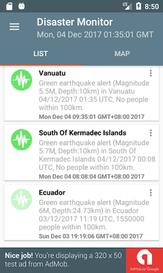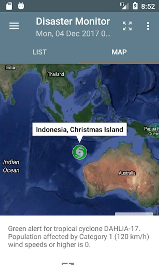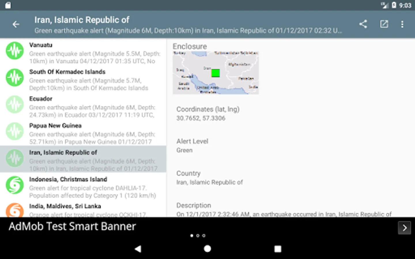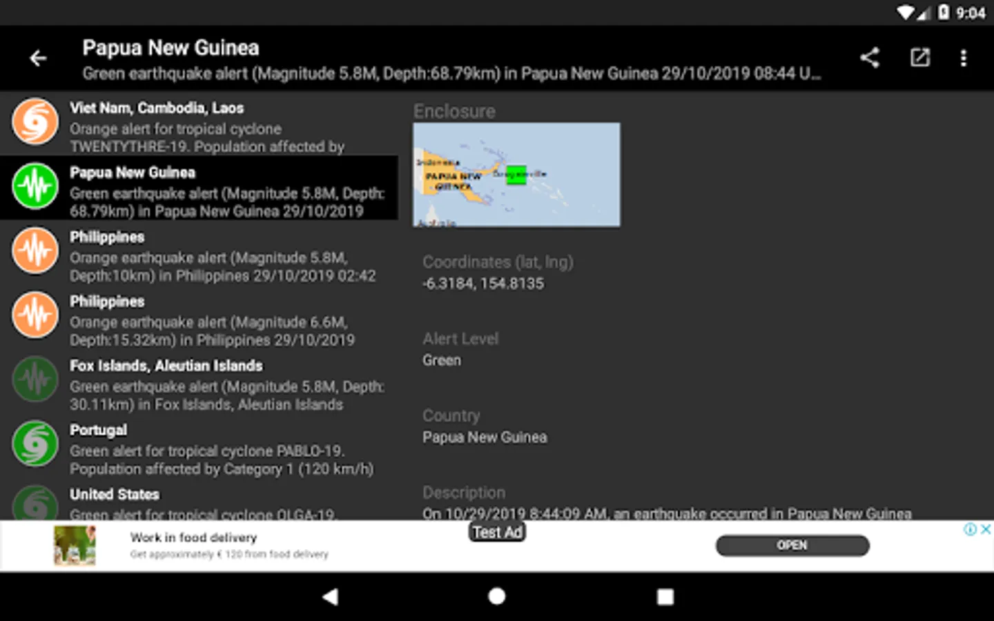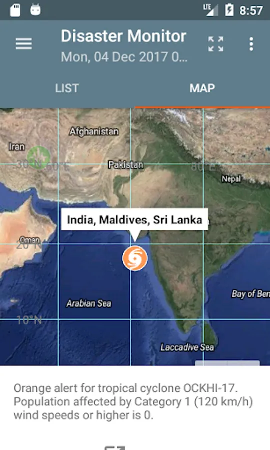 You can monitor natural disasters around the world, as published by the Global Disaster Alert and Coordination System - www.gdacs.org. The app shows the latest natural disasters like earthquakes, droughts, volcano eruptions, tropical cyclones, tsunamis and floods as color coded icons in a list as well as on a Google Maps backdrop; the icon colors indicate the alert level - green, orange, and red. The icon will look more transparent the older the event was published. Clicking on the item will bring up more details about the disaster event. UTM or geographic grids can optionally be displayed on the map.