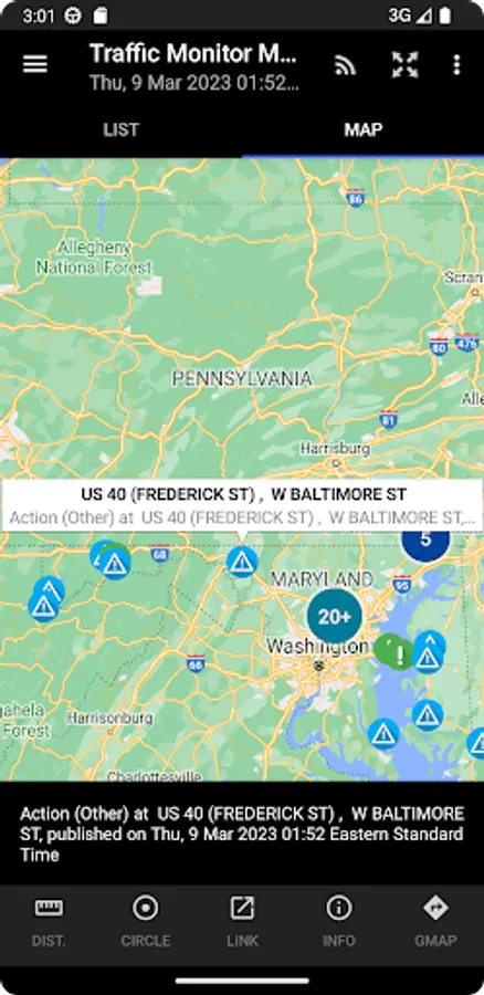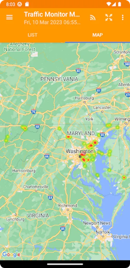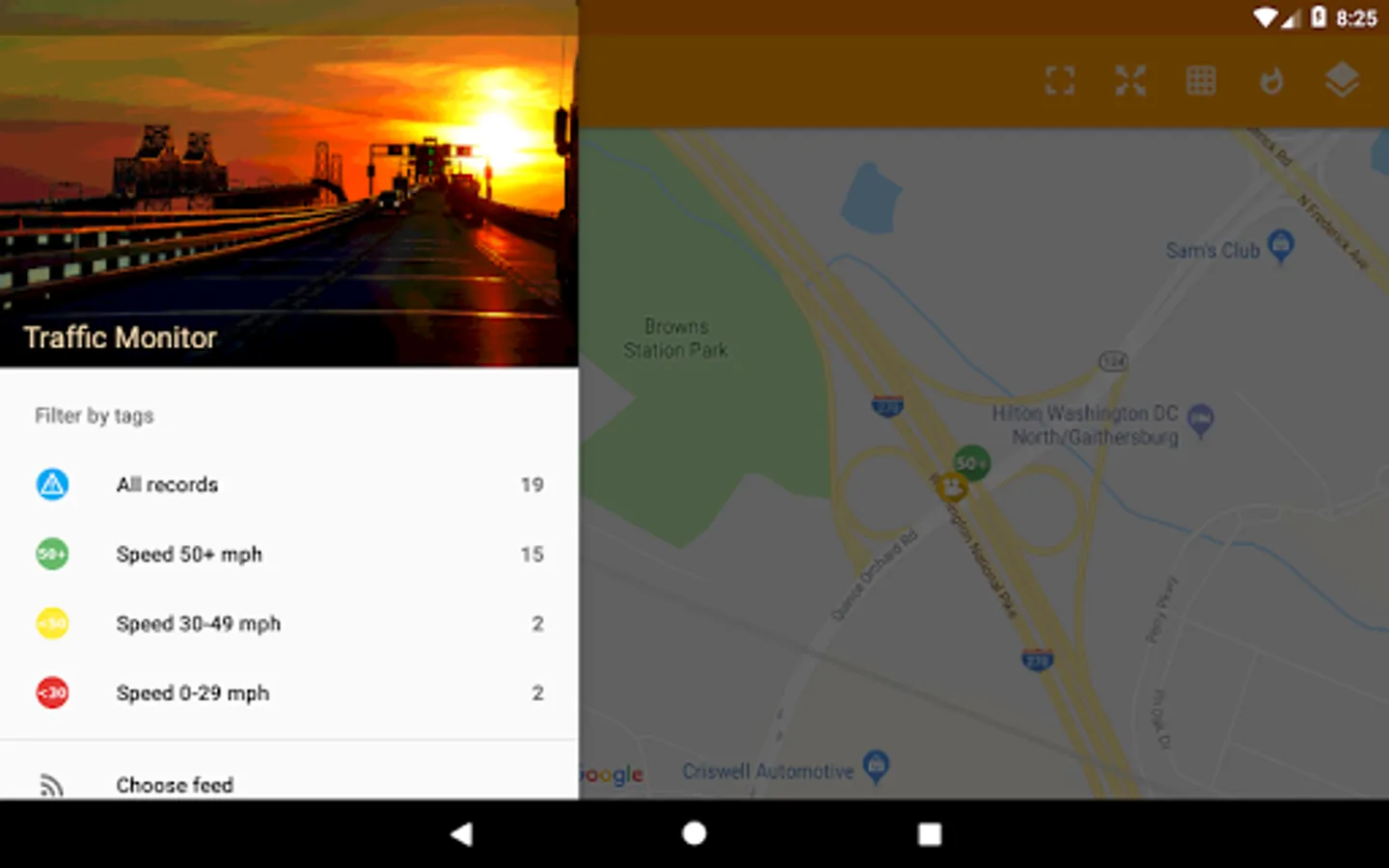Users can download near real-time data feeds to monitor information about traffic incidents and events, active road closures, average travel speeds on Maryland's highway system using this app. The traffic information can be viewed as a text list, or on a map as icons. Incident details can be viewed by tapping an item on the list or a marker icon on the map display. If the map display looks too cluttered, there are filters to filter away unwanted incidents from the list or the map. In addition, the incidents can also be displayed on the external Google Maps app for better visualization of the traffic incident. When users zoom into the map, web cam markers will appear; and when tapped, a browser will pop up to display a live video feed from the selected camera.