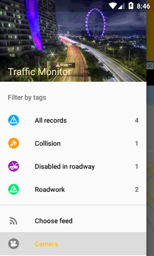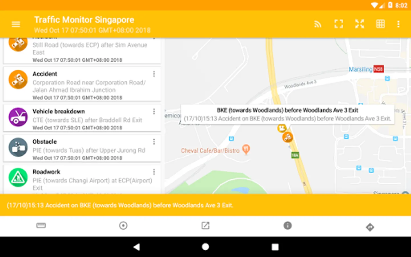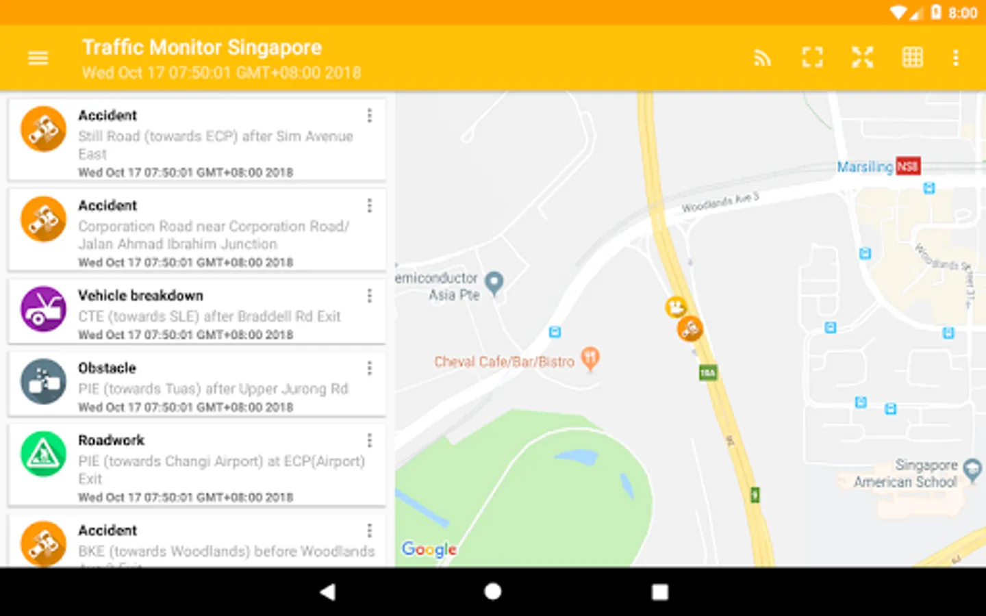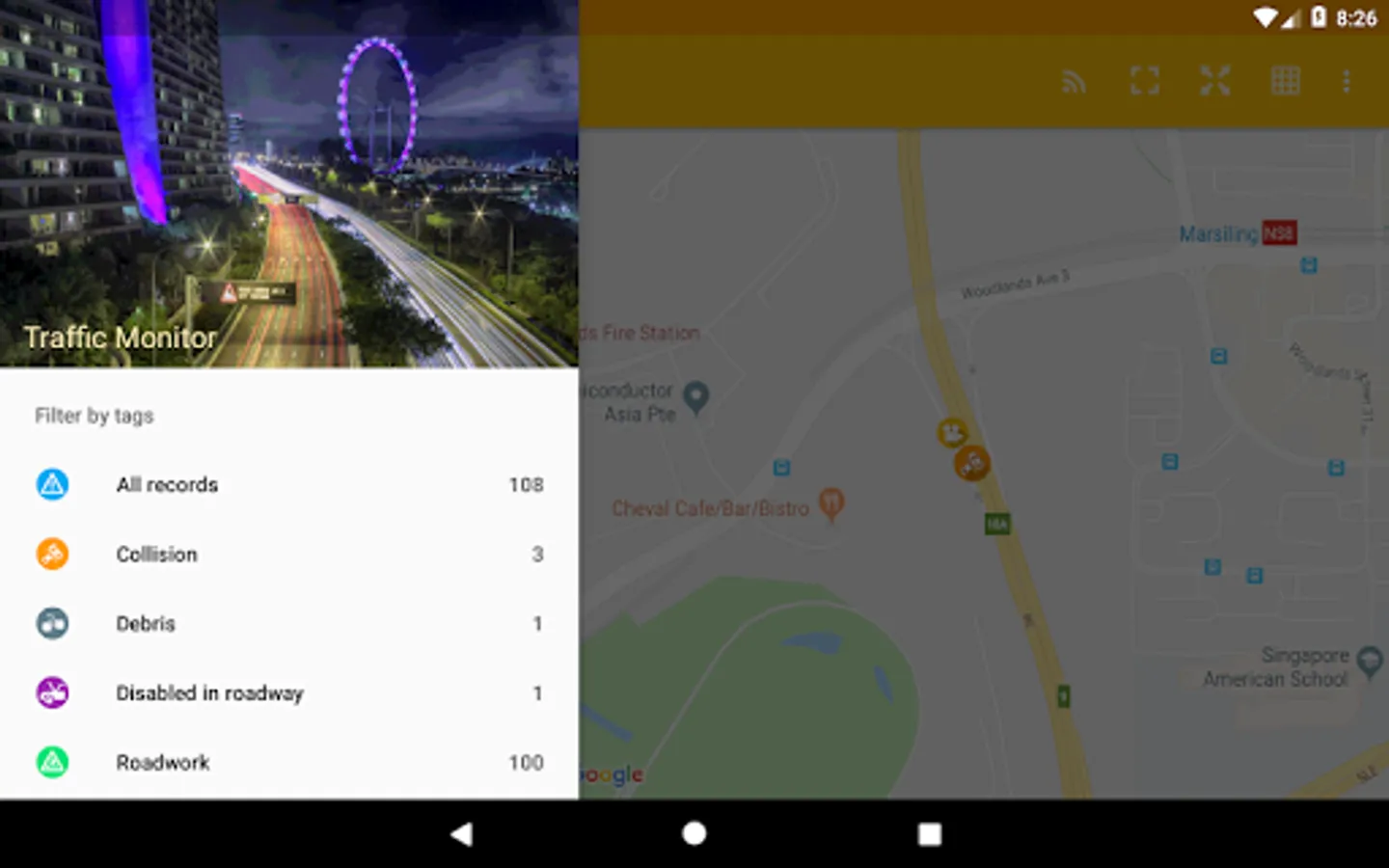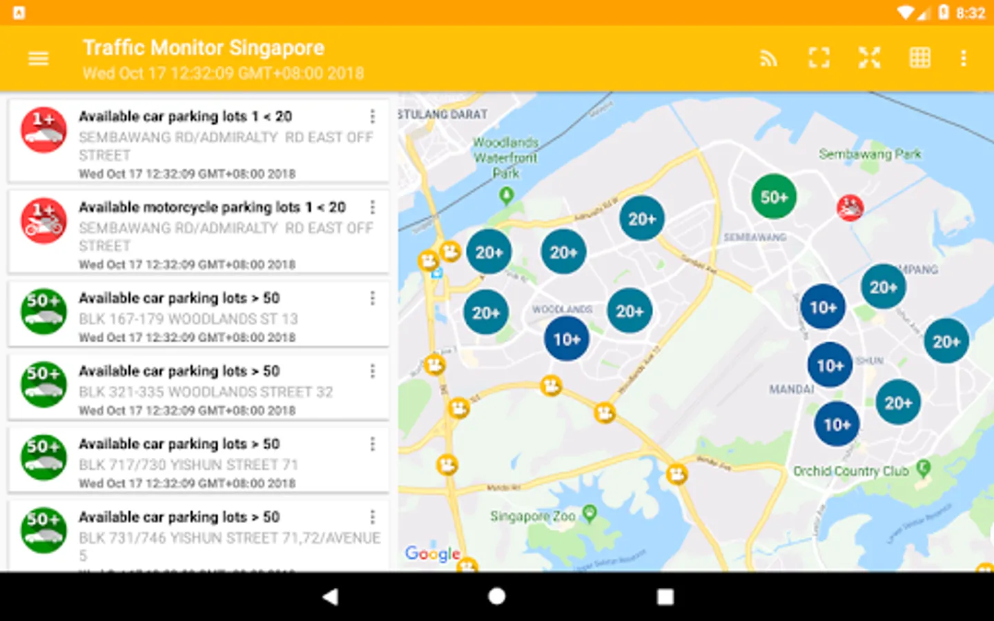 Users can find available car, motorcycle, and heavy vehicle parking lots, and monitor traffic incidents on Singapore's road network including accidents, vehicle breakdowns, obstacles, road blocks, traffic diversions, traffic camera images etc. using this app. The parking lots availability, traffic incidents and planned roadworks can be viewed as a text list, or on a map as icons. Incident details can be viewed by tapping an item on the list or a marker on the map display. A tag filtering function is available to easily filter away unwanted incidents from the list or map by text. The incidents can also be displayed on the external Google Maps and/or Street View apps for better visualization of the traffic incident. Also has basic image brightness and auto-level commands for the traffic camera images.
