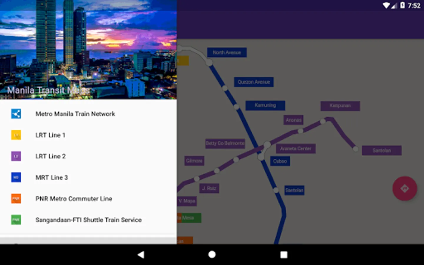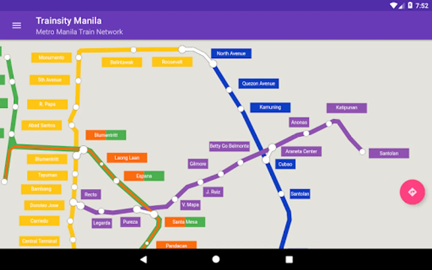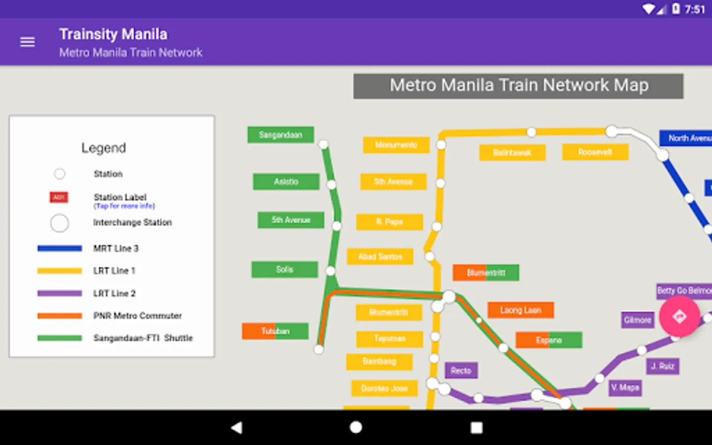 Find your way around the city of Manila using the high resolution vector maps of the MRT-3, LRT-1, LRT-2, PNR Sangandaan-FTI Shuttle Service and PNR Metro Commuter lines. The maps have small file size footprints but with many levels of zoom and can work offline without connecting to the Internet. Users can click the train station labels to open Google Maps or Street View, where they can use all the functions of the Google apps to visualize the surrounding area and/or perform routing for directions. There is also an offline function to calculate the best way to travel from a station to another station with a direction breakdown and estimated timings (which may vary from the actual travelling time). The app is also integrated with a MRT-3 CCTV static snapshot viewer for displaying ticketing and platform areas of all MRT-3 stations.