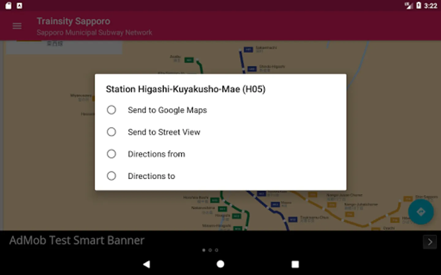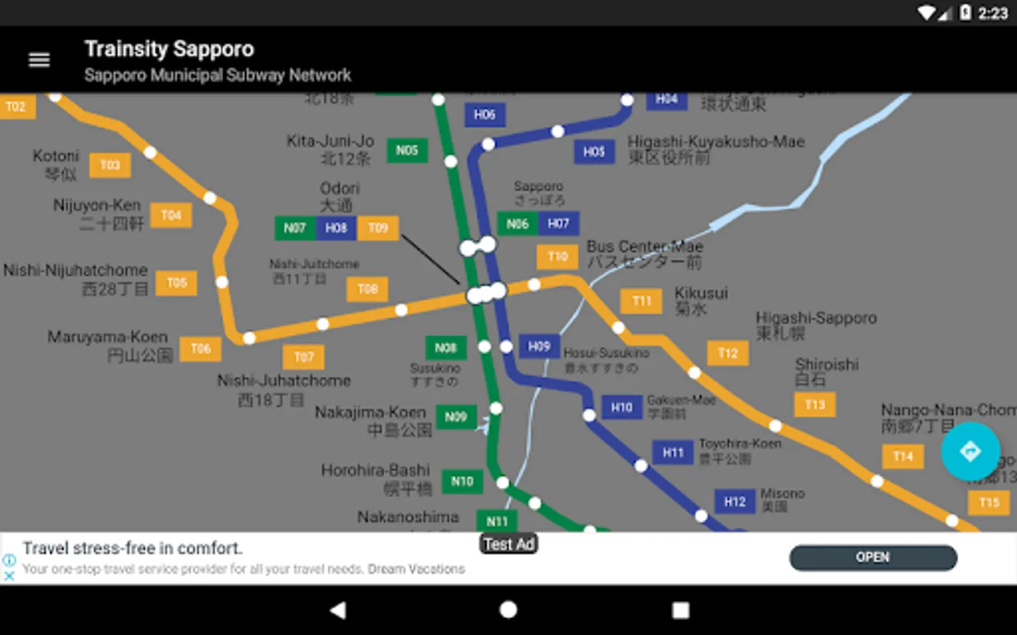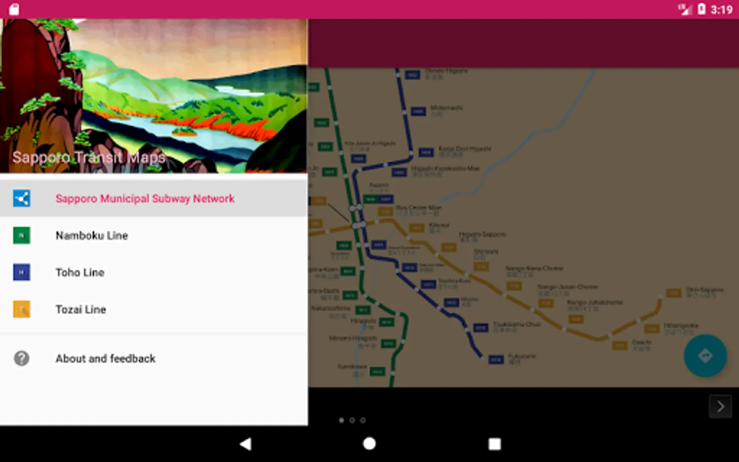 Find your way around Sapporo city's subway using the high resolution vector maps of the train network. The following metro rail lines are available: Namboku, Tozai, and Toho lines. The maps have small file size footprints but with many levels of zoom and can work offline without connecting to the Internet. Users can click the train station box labels to open Google Maps or Google StreetView, where they can use all the functions of the Google apps to visualize the surrounding area and/or perform routing for directions. There is also an offline function to calculate the best way to travel from a station to another station with a direction breakdown and timings (which may vary from the actual travelling time).