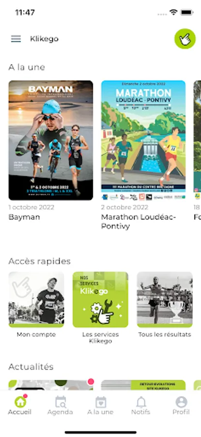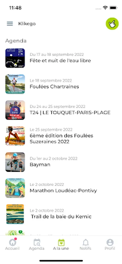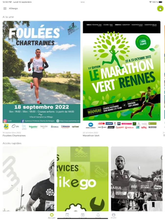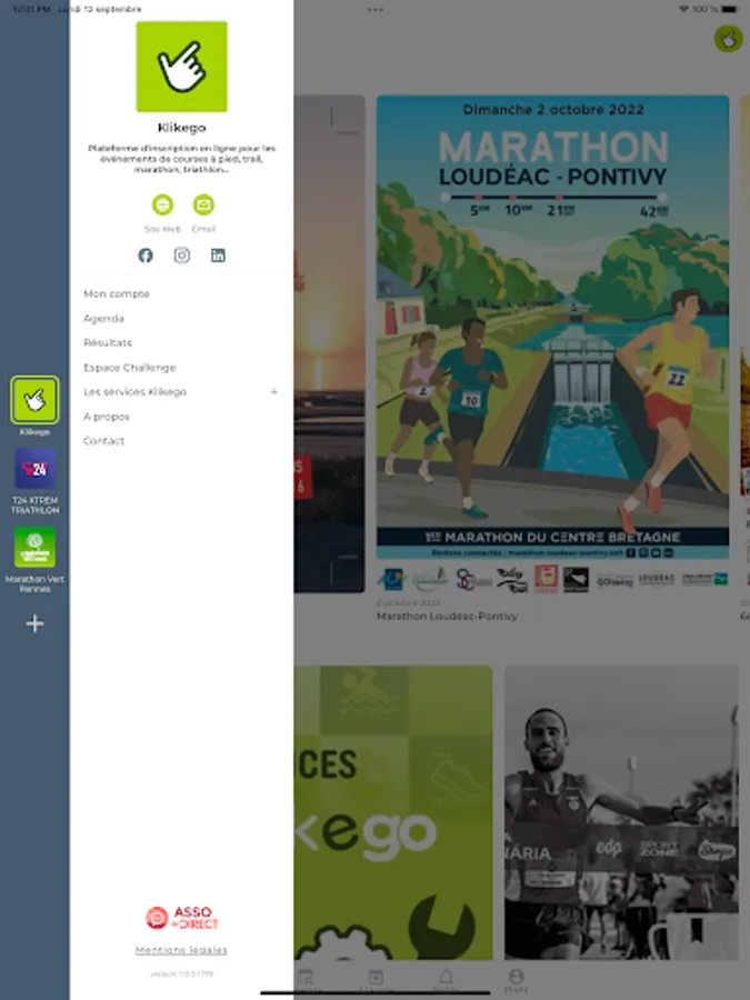 The Klikego app allows you to consult the schedules and results of sporting events. You can also register for the various events, attach your medical certificate and pay your commitment online.