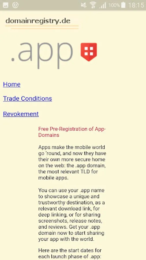 The App-Domain is a secure namespace, meaning that HTTPS is required for all .app websites. You can buy your App-Domain now, but in order for it to work properly in browsers you must first configure HTTPS serving. You can acquire webspace with pre-configured encryption at us without any additional costs or SSL Certificates.