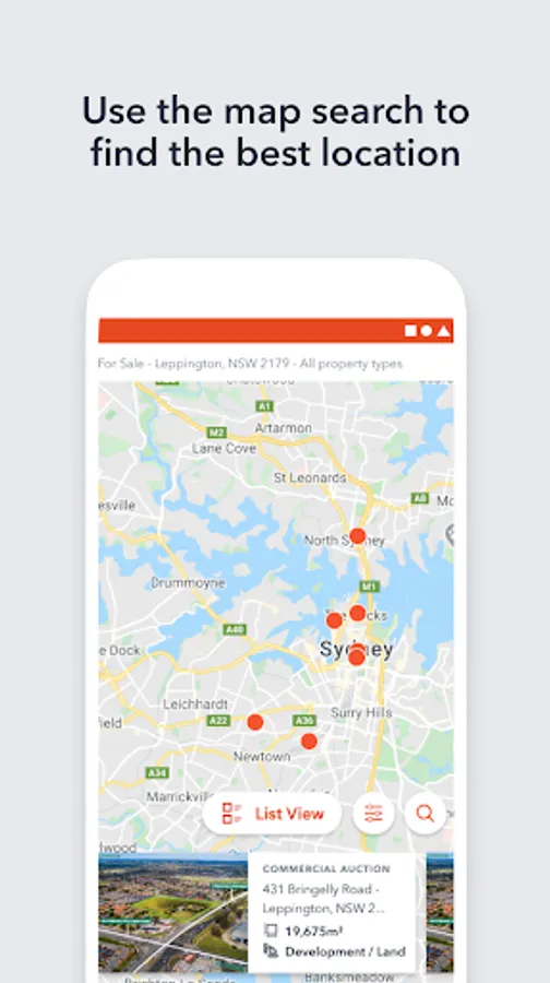 Get a bird’s eye view of commercial properties and real estate that fit your needs. Filter and narrow your search with our innovative map features. Then tap on the orange pins on properties you like and we’ll show you important details you need to know such as address, land size and commercial property type.