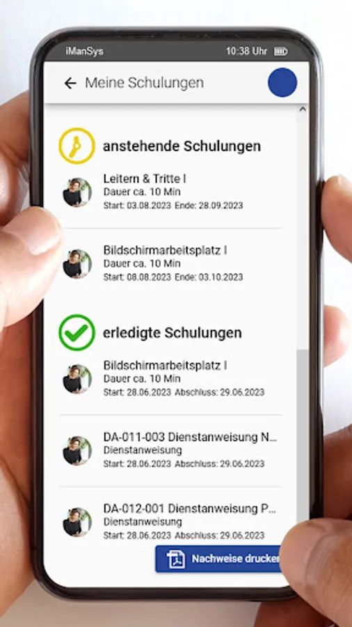 With the iManSys app, your employee training can be carried out easily and conveniently on your mobile device (e.g. smartphone or tablet). The training status (overdue/pending/completed) can be viewed at any time. After the training, you can carry out an optional comprehension check.