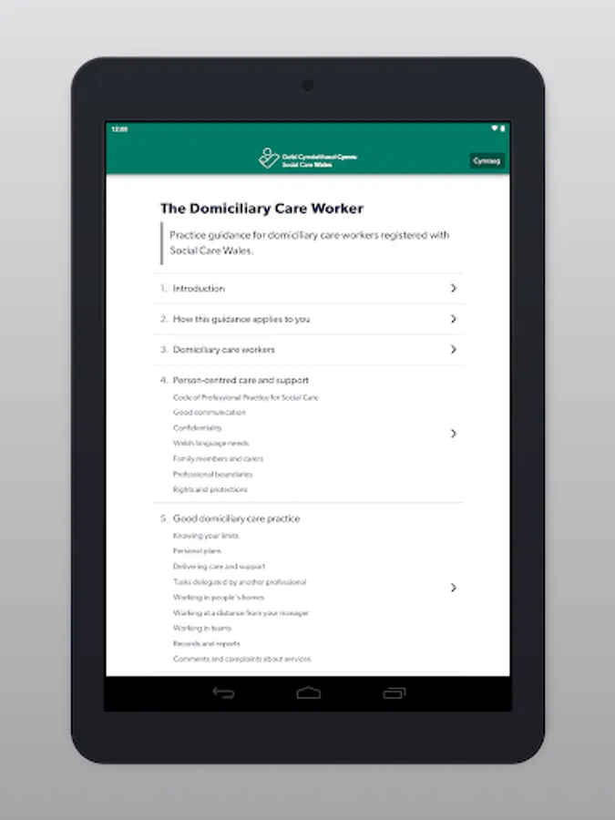Mae'r Gweithiwr Gofal Cartref yn disgrifio'r hyn a ddisgwylir gan weithwyr gofal cartref. Mae'n cynnig arweiniad ymarferol wedi'i deilwra i arwain a chefnogi chi yn eich gwaith.