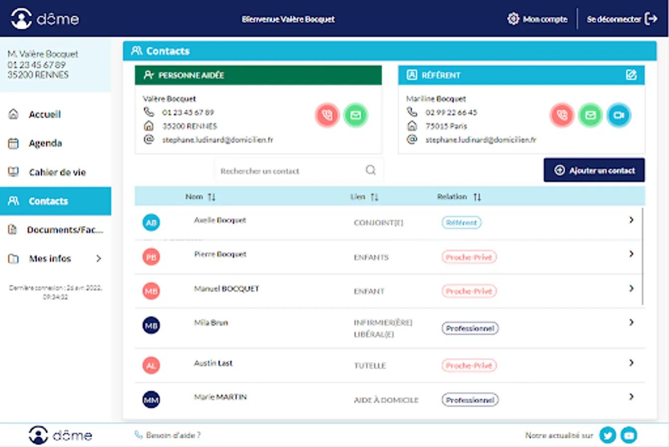 "Contacts" brings together the contact details of all the entourage (professionals, family, friends) of the person at home and allows you to communicate with them by video, audio or text.