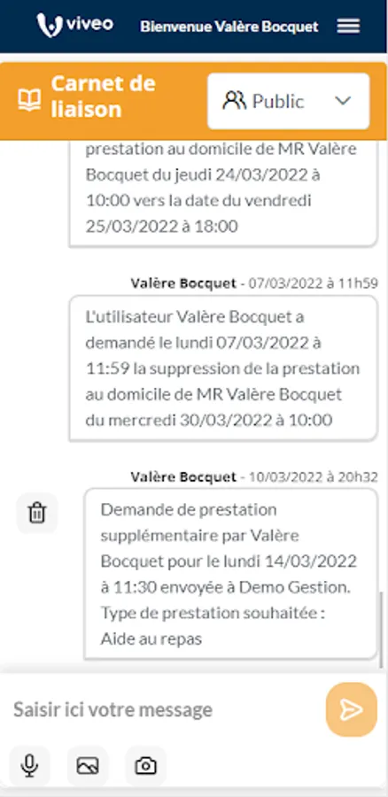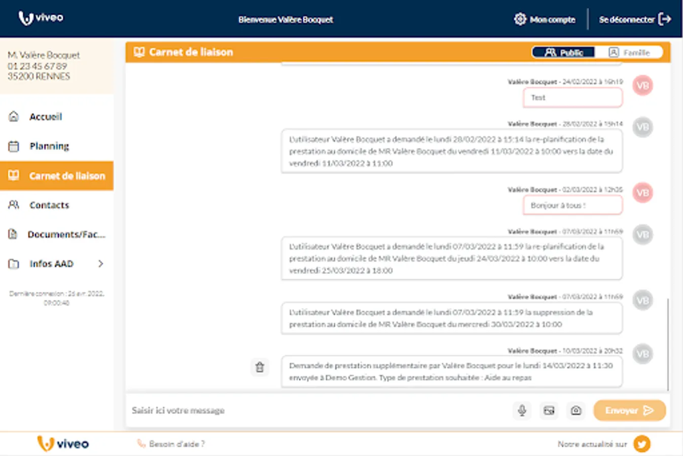 • Possibility of mentioning absences and / or requests for postponement of interventions online.