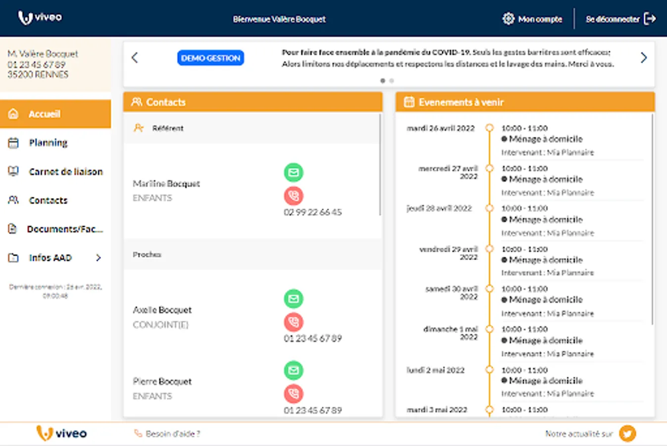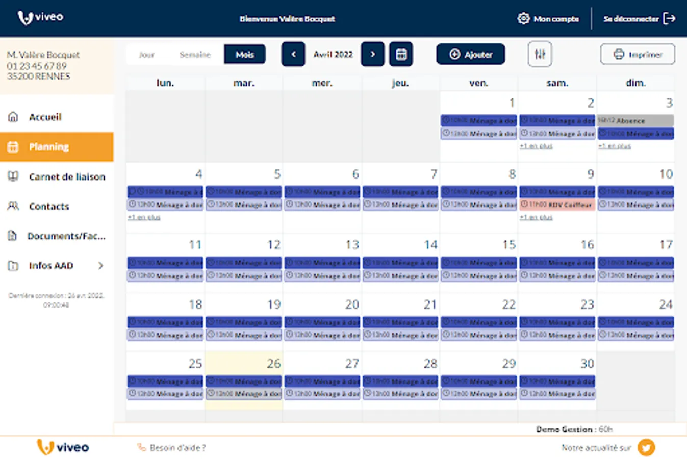 • Help for seniors, disabilities and loss of autonomy at home: Vivéo helps with meals, home maintenance, and shopping. One or more carers accompany our elders for a secure and optimal maintenance at home.