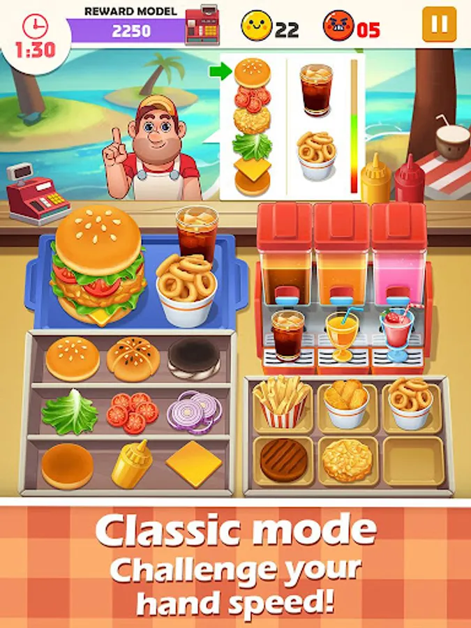 In 《Cooking Master fever》, you need to operate a number of their own American fast-food restaurant, fast cooking customer meal, and launched a variety of new products to meet customer taste buds, including hamburgers, breakfast, snacks and package these four categories, the use of the kitchen is rich and varied. In the work, but also always pay attention to customer waiting, patience, and constantly add raw materials. With the increase in customers, you may need automatic upgrade machines, advanced purchase calls, advanced waffle machines and other props upgrades to meet business needs. [game features]