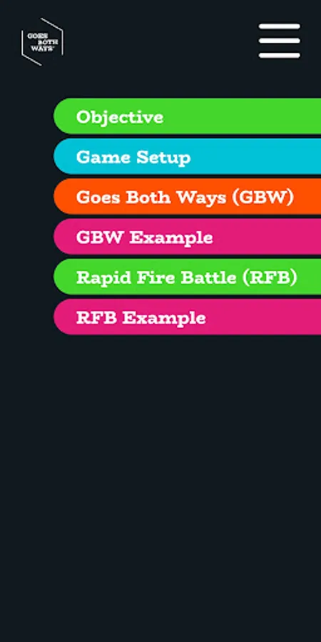 There is no better companion than the Goes Both Ways (GBW) app! Here you will find the game selector and timer for all your gameplay needs.